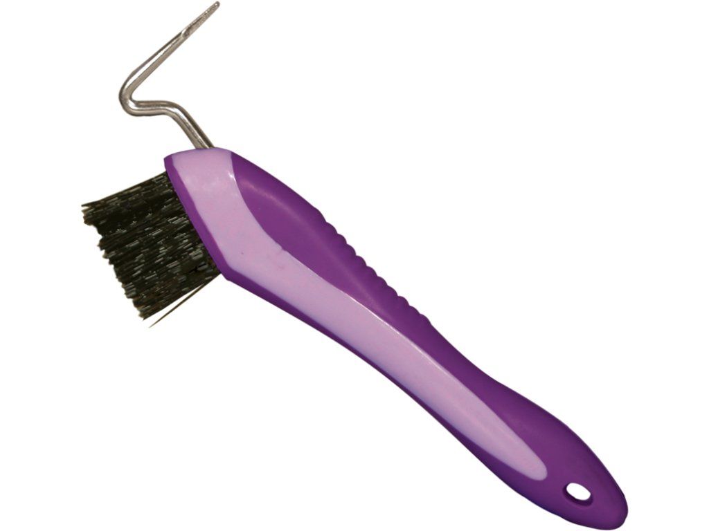 Háček na kopyta s kartáčkem, s gumovou rukojetí. Mix barev