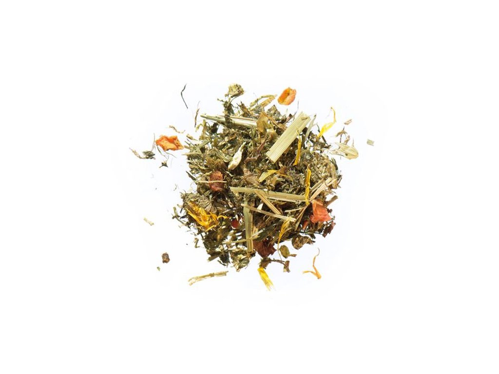 Obsahuje sušenou zelenou vlákninu, černý kmín, jablečné výlisky a zeleninu.
