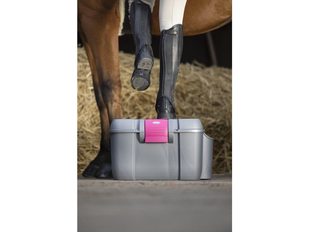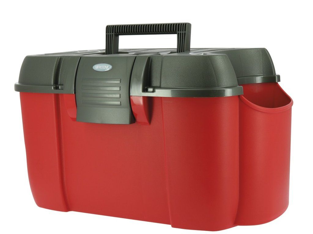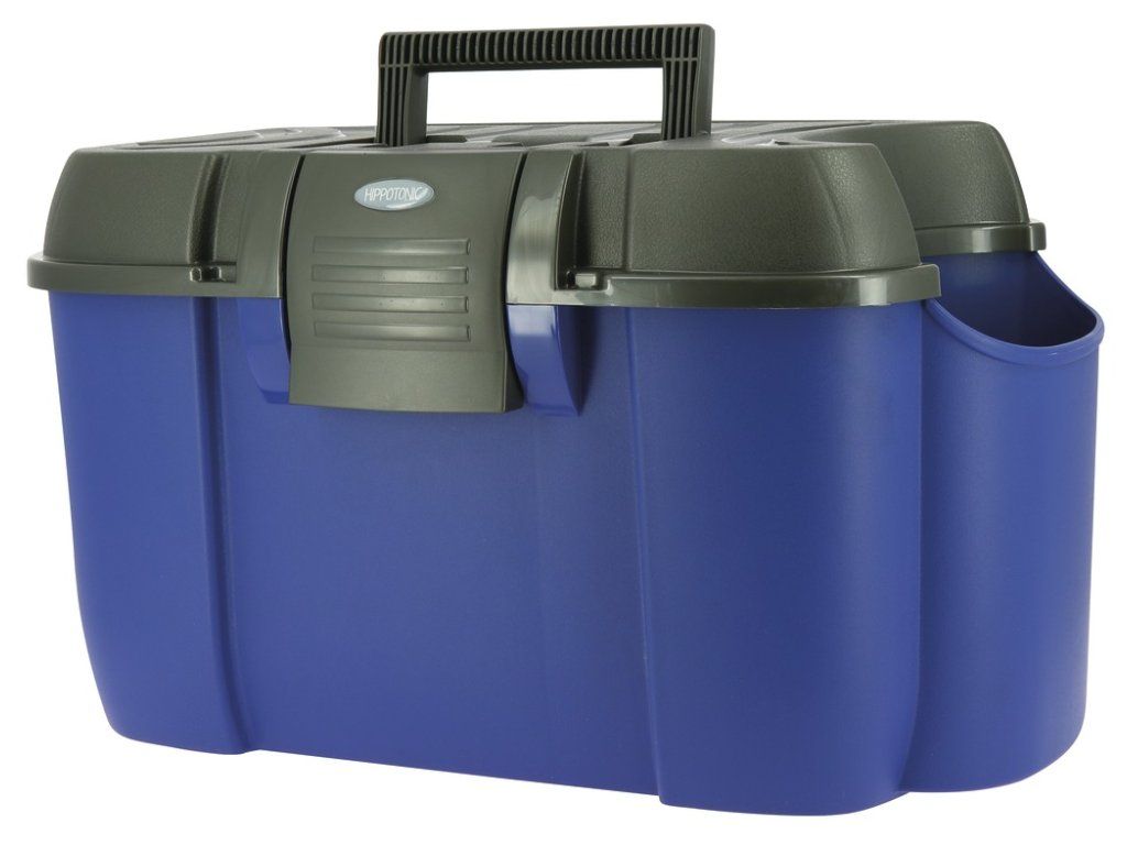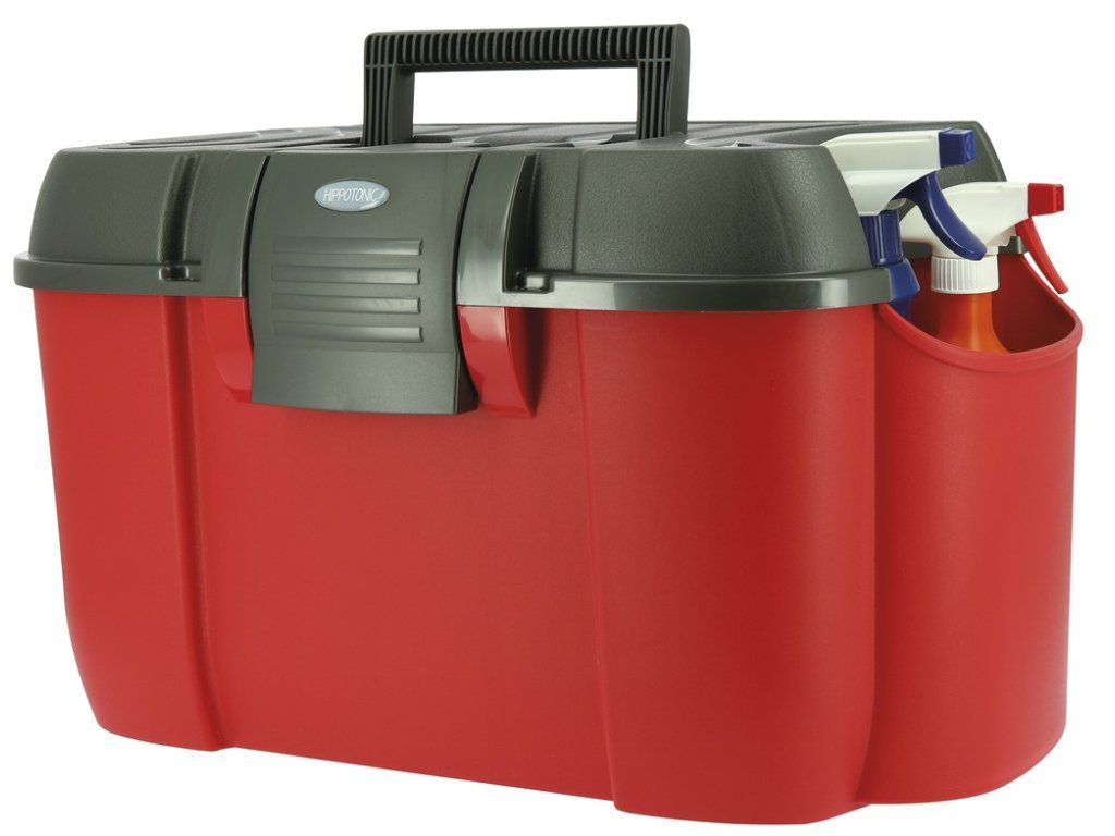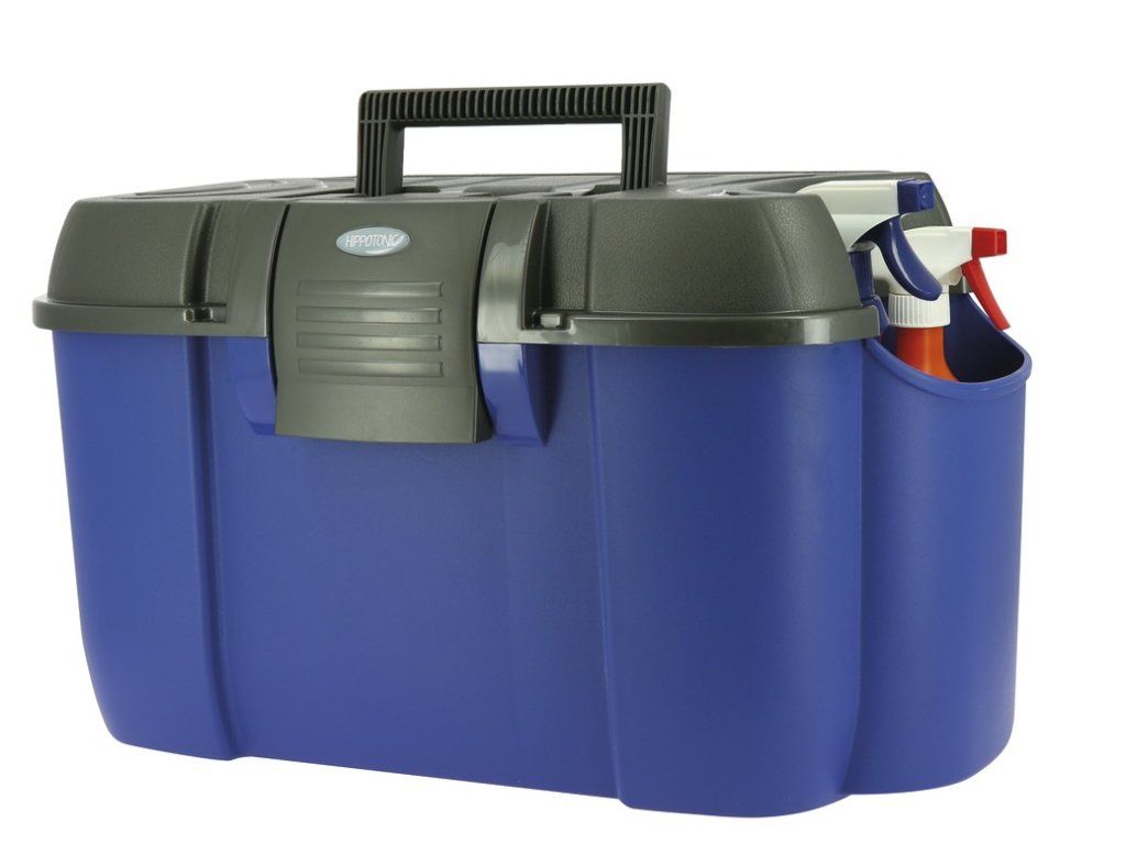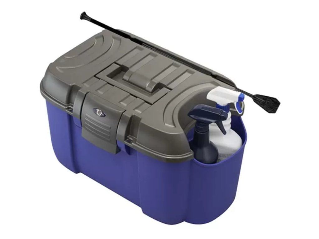 Velmi praktický a kvalitní box na čištění s velkou postranní ''kapsou'' na uložení tekutých přípravků. Postranní kapsa udržuje přípravky vzpřímené, aby nedošlo k rozlití. Odolná plastová konstrukce a snadné upevnění víka zaručuje, že všechny vaše potřeby na čištění zůstanou chráněny uvnitř v boxe. Vnitřní oddělení pro pohodlné uspořádání potřeb. Box může být využit jako stolička při upravování hřívy nebo nasedání, nosnost až 120kg.