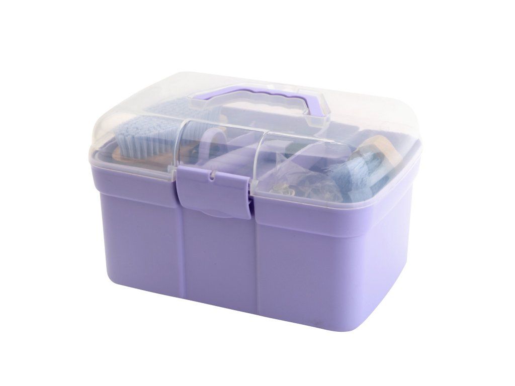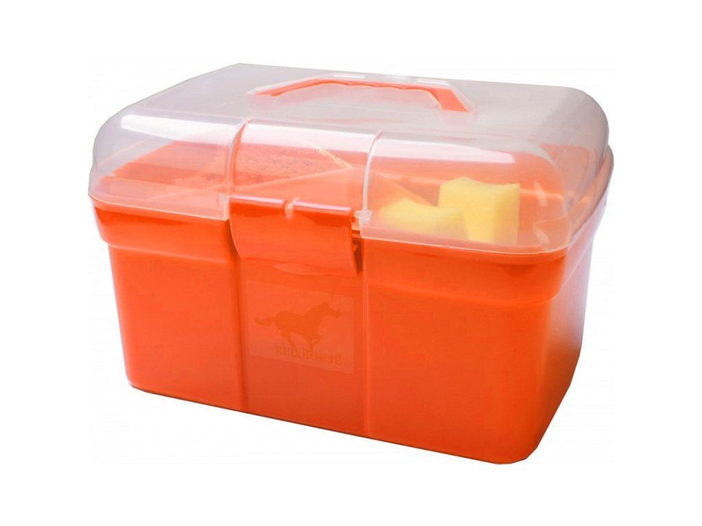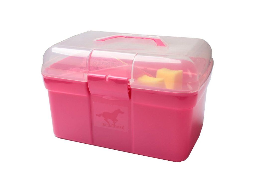 Uvnitř boxu se nachází : kopytní háček, gumičky do hřívy a ocasu, tvrdý kartáč, měkký kartáč, houbička ve tvaru koníka, štětec na kopyta s krytkou, plastové hřbílko, gumové masážní hřbílko, kovový hřeben na hřívu s ocas.
