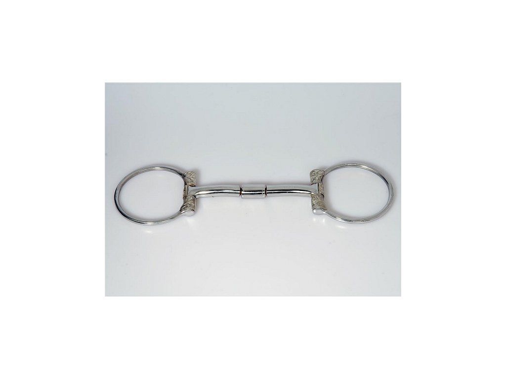 Kvalitní stihlové udidlo typu D-Ring snaffle od značky B. Allen, vyrobené z odolné nerezové oceli se zdobenými stříbrnými prvky pro elegantní show vzhled. Díky pevným D-kroužkům poskytuje lepší vedení hlavy koně a stabilnější působení v hubě oproti klasickým volným kroužkům.