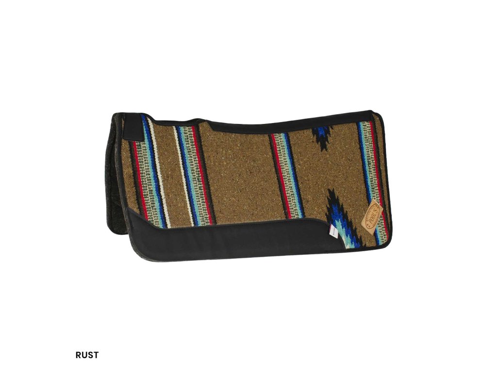 Filcová westernová deka s výztuhami na podbřišník a Navajo vzory. Vykrojený otvor na kohoutek zabraňuje podření, zpevnění v okolí pak pomáhá dece držet tvar a nepadat do zad koně.