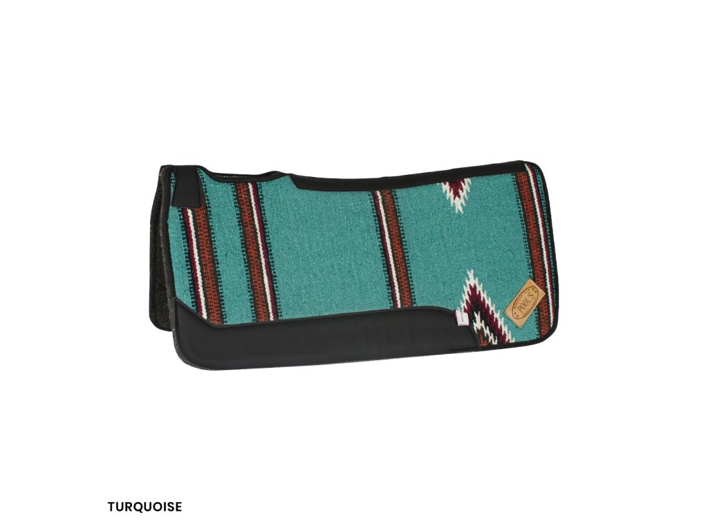 Filcová westernová deka s výztuhami na podbřišník a Navajo vzory. Vykrojený otvor na kohoutek zabraňuje podření, zpevnění v okolí pak pomáhá dece držet tvar a nepadat do zad koně.