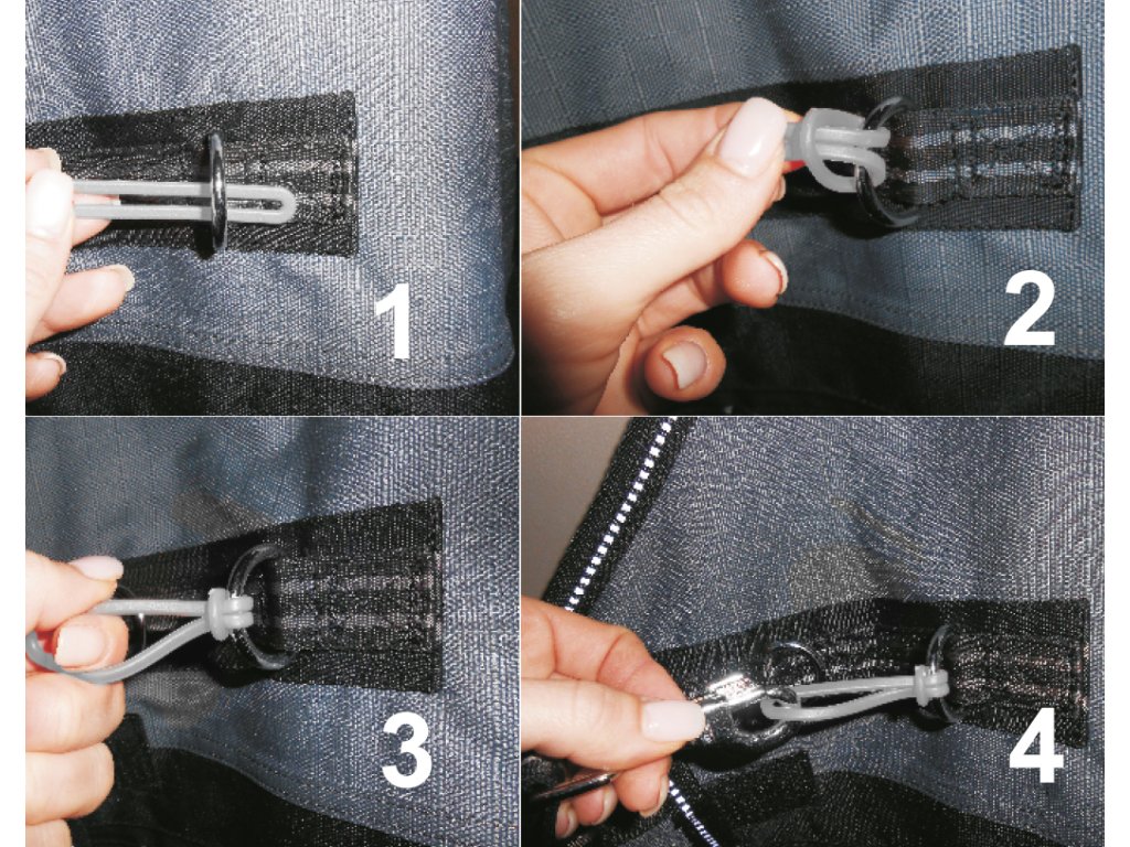 Sada gumiček, které ochrání deku před roztržením. Gumička se protáhne do oka do kterého by jste zapnuli karabinu, ale karabinu zapínáte až do očka které vzniklo z gumičky. Takže při pnutí se roztrhne gumička a nepoškodí se karabina a deka.
