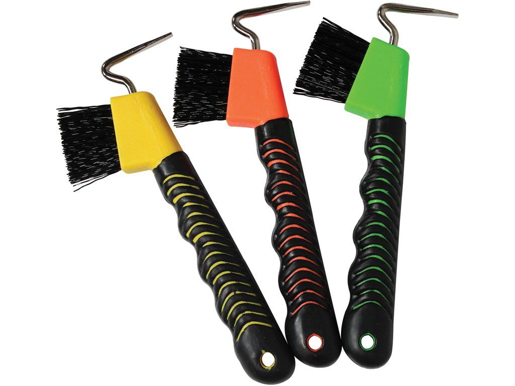 Háček na kopyta s kartáčkem, ručka s gumovým potahem.