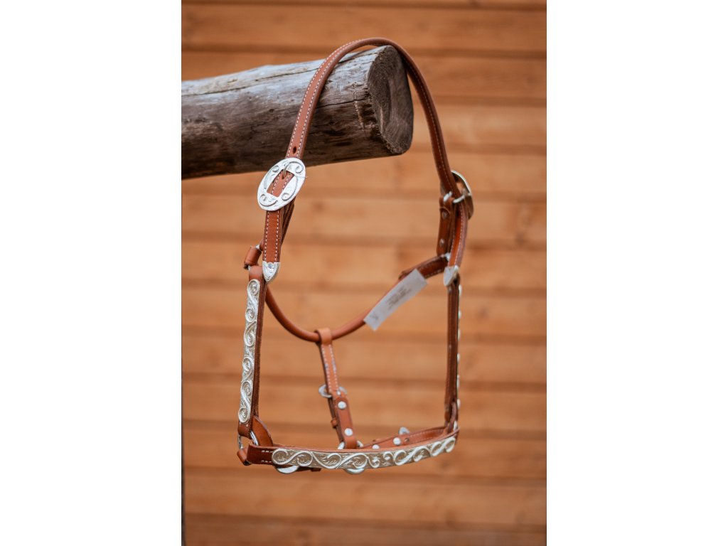 Vysoce kvalitní haltrová ohlávka z kůže. Stříbrné kovaní s ručně rytým zdobením.