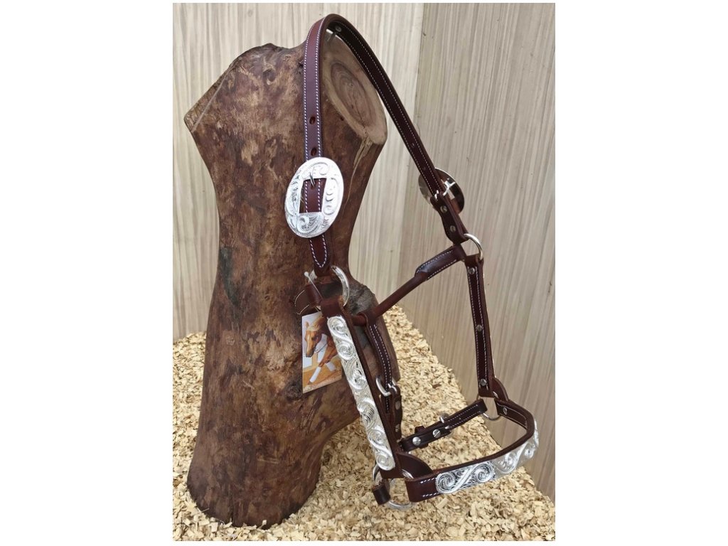 Vysoce kvalitní haltrová ohlávka z kůže. Stříbrné kovaní s ručně rytým zdobením.