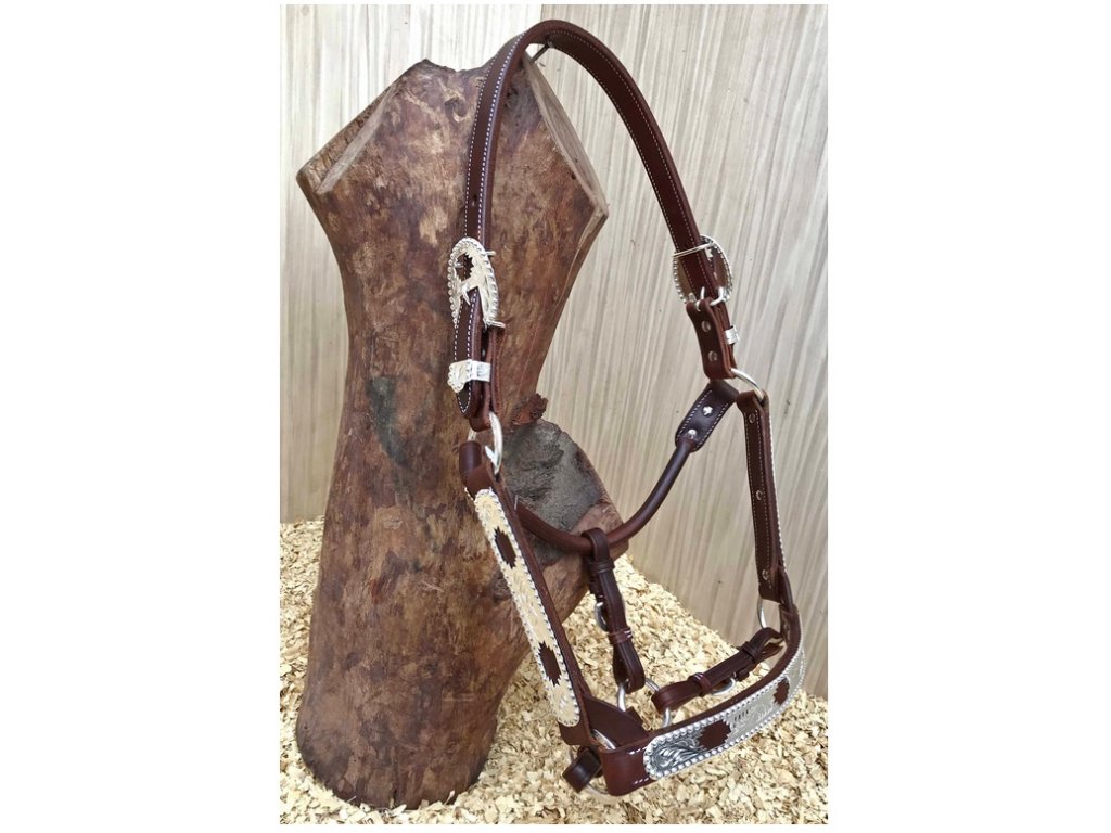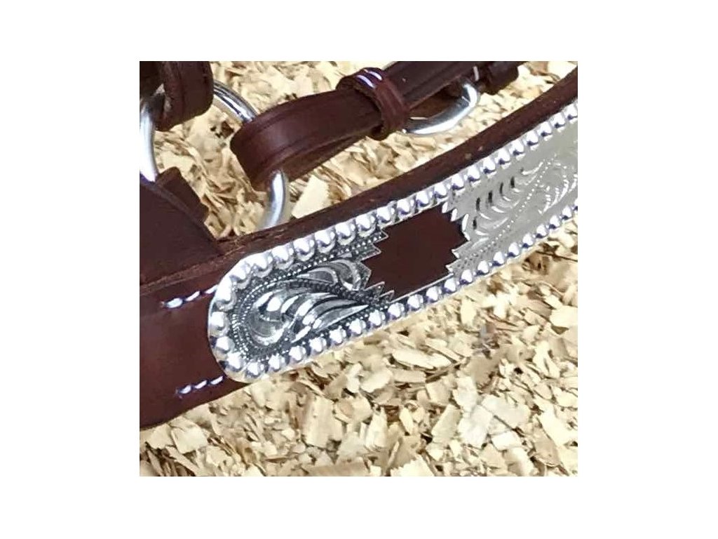Vysoce kvalitní haltrová ohlávka z kůže. Stříbrné kovaní s ručně rytým zdobením. Velikost jednotná QH. Nastavitelná. Bez vodítka.