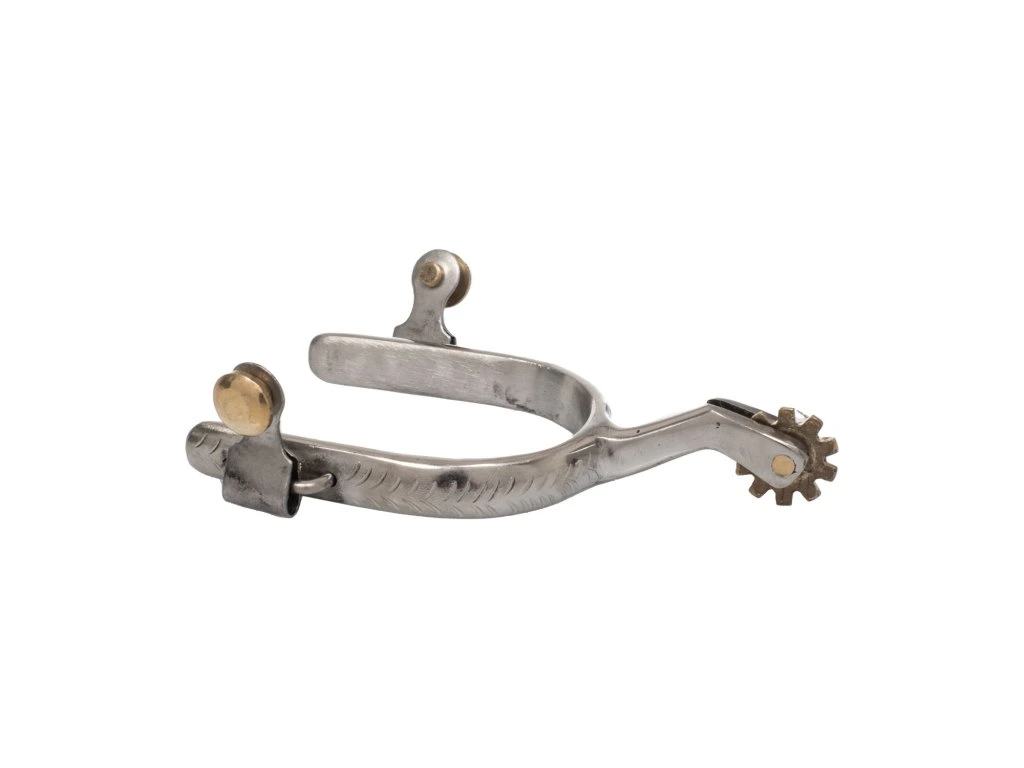 Ostruhy z nerezové oceli se zdobenými detaily.