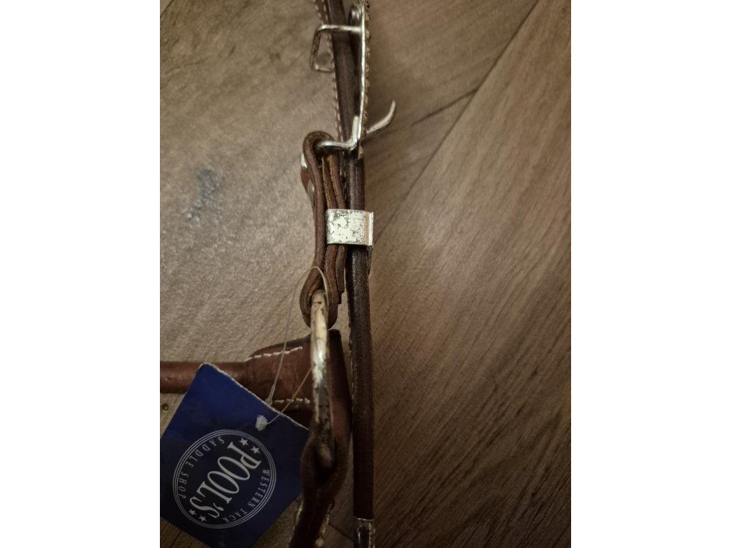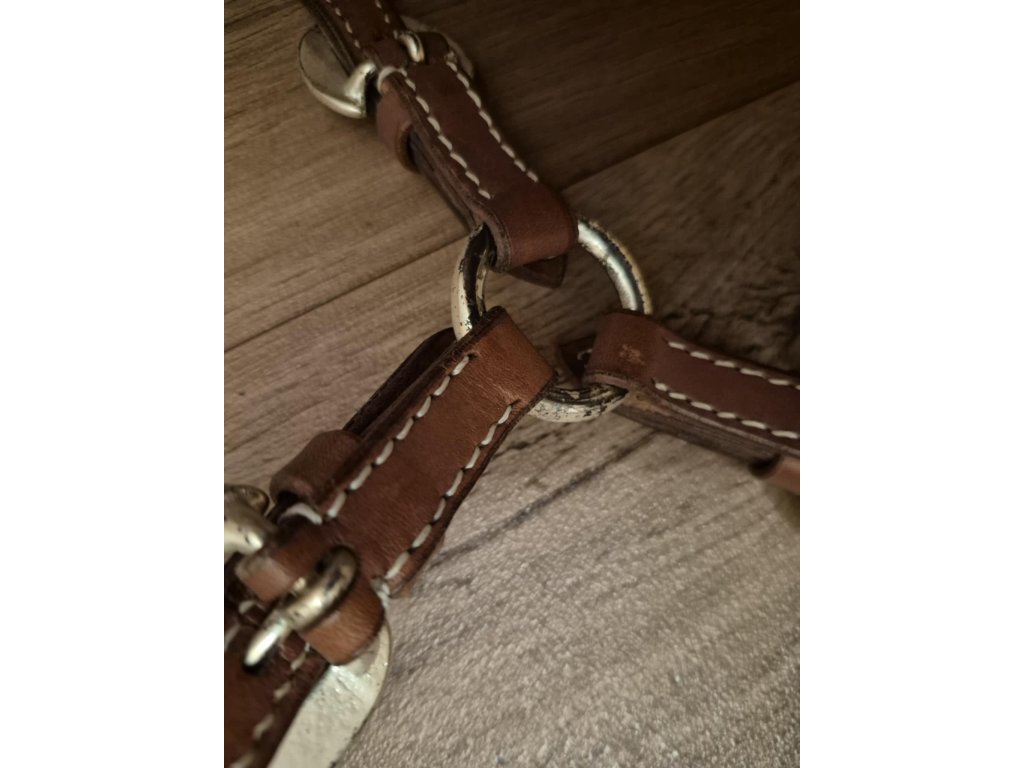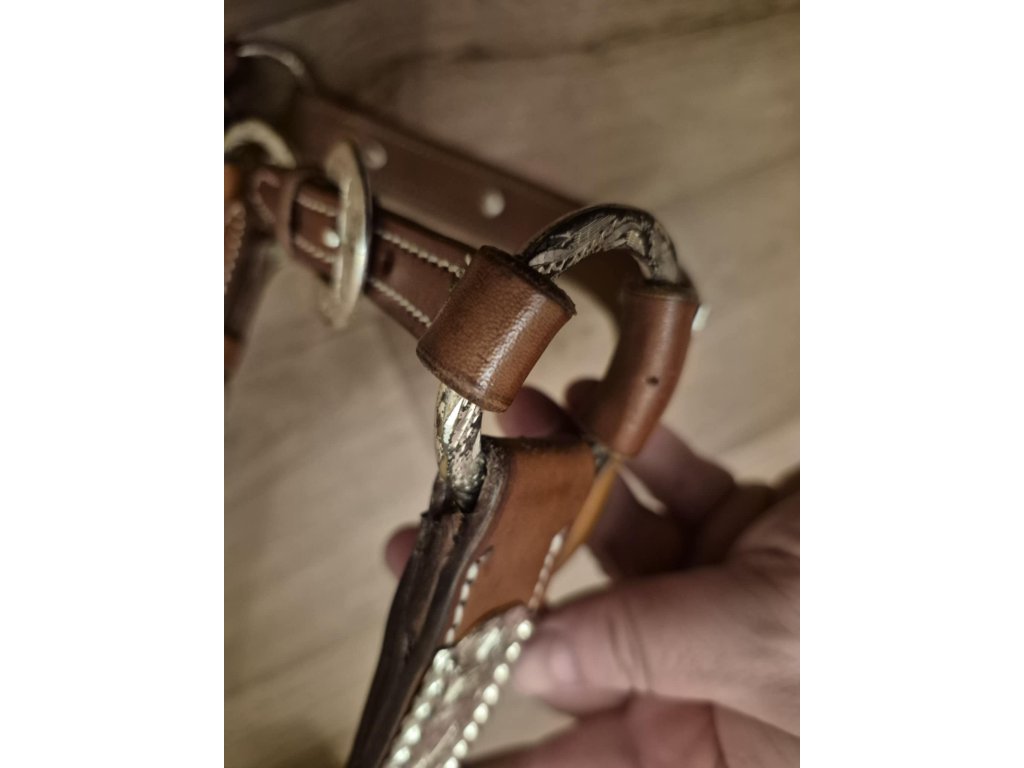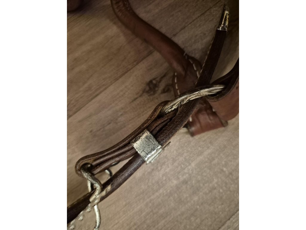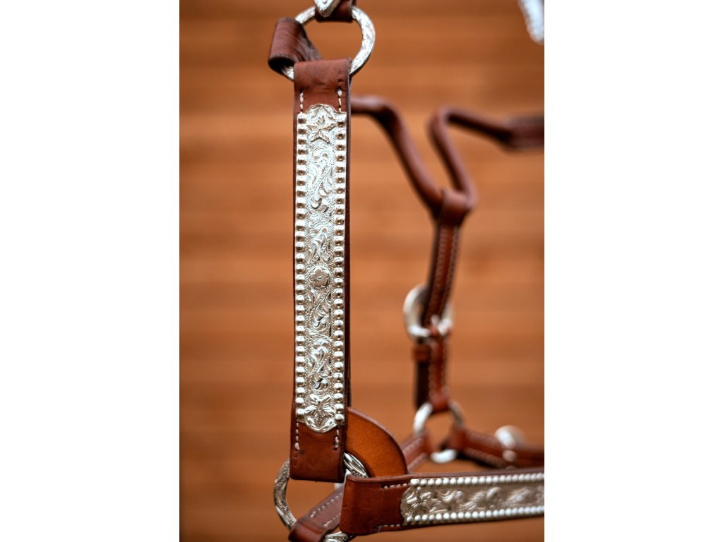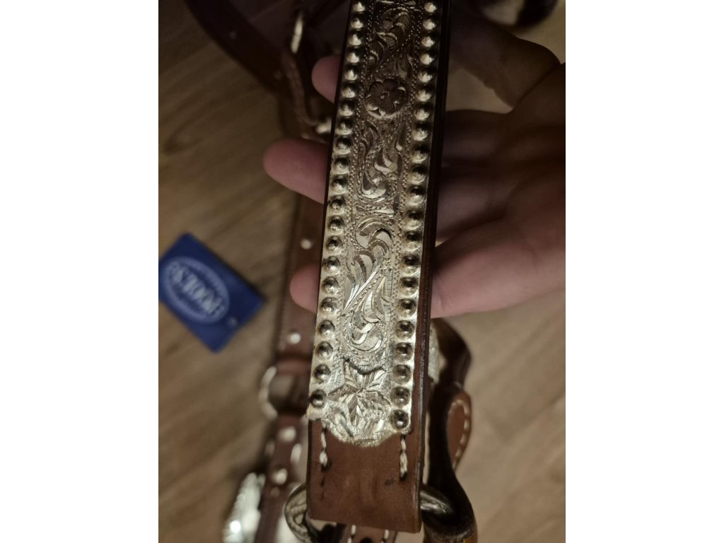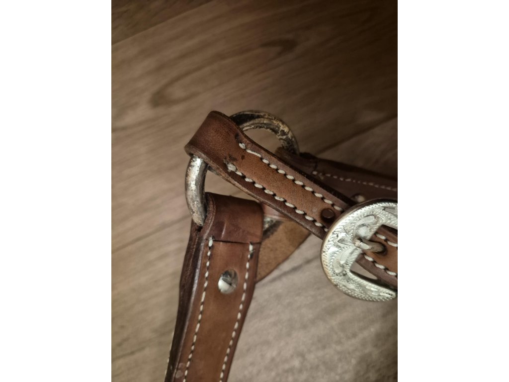 Sleva na kovové části, vyfoceno. Haltrová kožená show ohlávka se stříbrným kováním