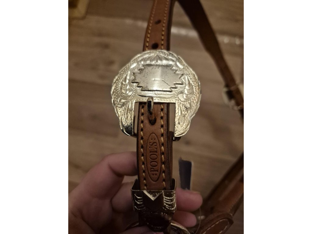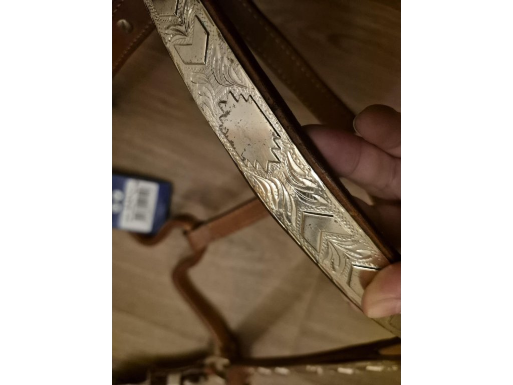 Sleva na poškrtané a oxidované stříbrné části. Westernová Show ohlávka se zdobením ve stříbrné barvě. Pozor, barva na obrázku odpovídá barvě Brown, nabízená barva je oříšek. Upozornění: tato ohlávka není nastavitelná pod nánosníkem, proto není vhodná pro Halter soutěže.