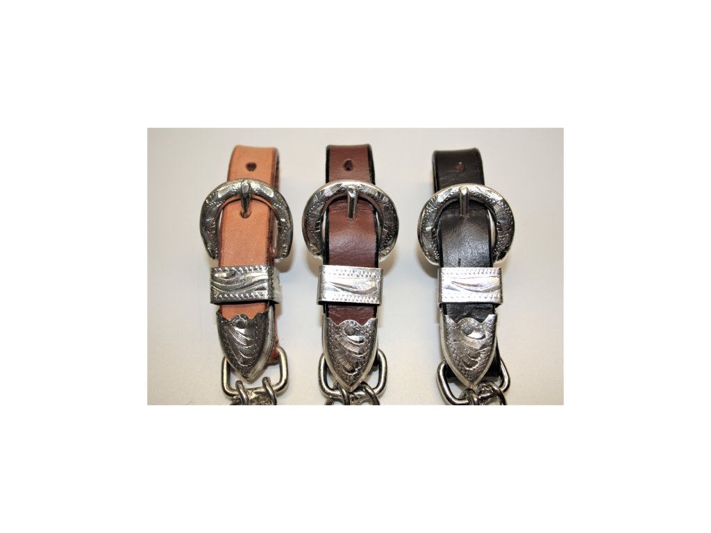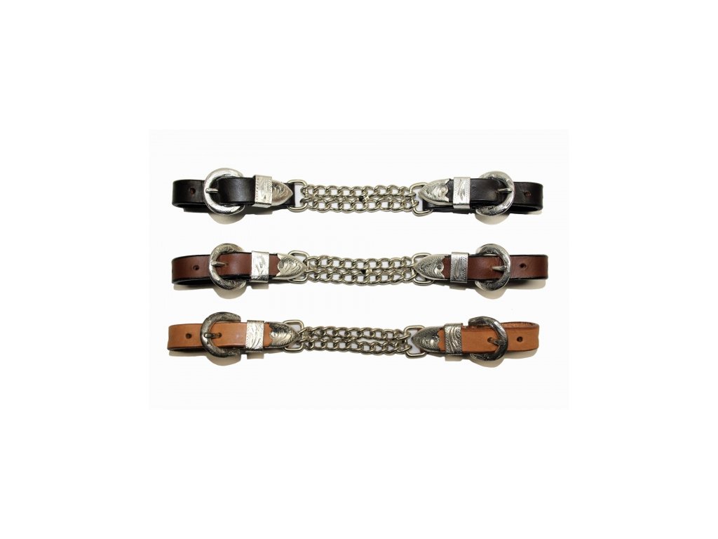 Kožený westernový podbradní řemínek s kováním ve stříbrné barvě, dvojitý řetízek. Stříbrné části jsou postiženy slabou oxidací šedé barvy, stačí vyleštit a nebo nechat tak, nelze skoro vidět.