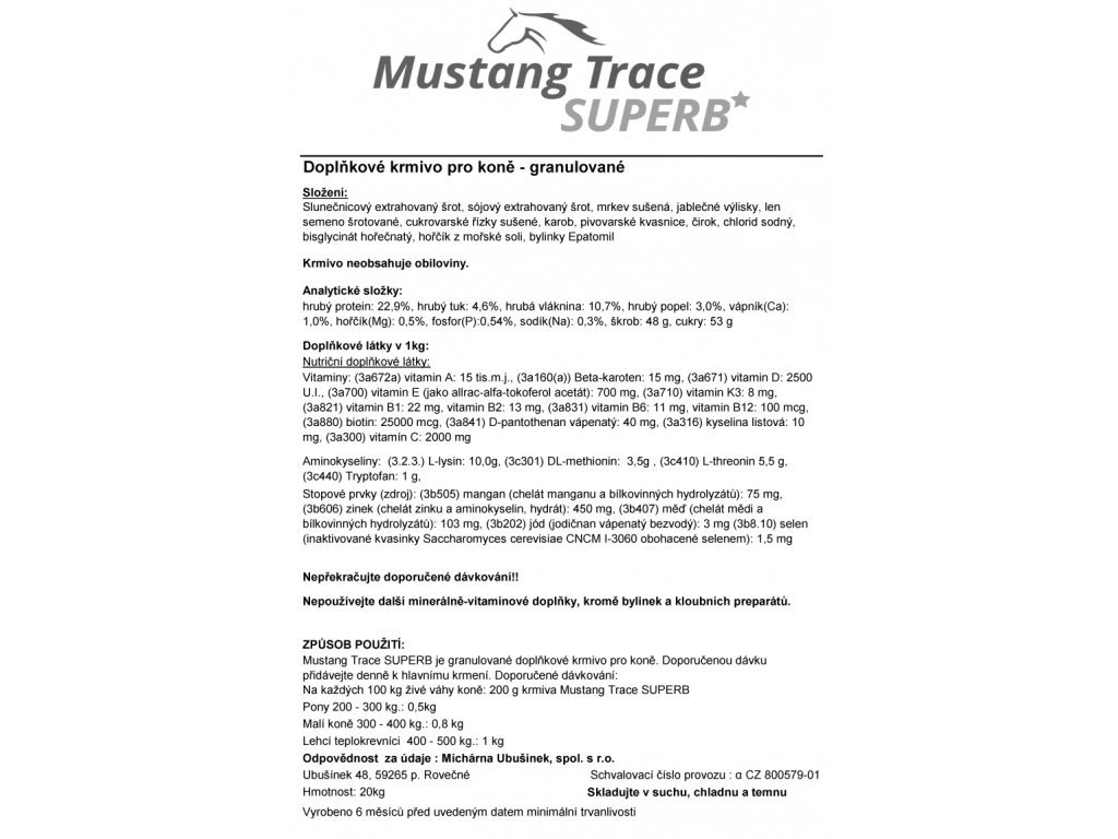 Mustang SUPERB dodá vašemu koni celé spektrum vitamínů, minerálních látek, stopových prvků a esenciálních aminokyselin, z nichž velká část se zde nachází přirozeně v surovinách. Vše pro silnou imunitu, perfektní horní linii a optimální nárůst svalové hmoty. Mustang Superb poskytne vašemu koni také ideální dotaci vitamínu E a selenu společně s tukem, který je nutný pro jeich dobré vstřebání. Důležité minerály a stopové prvky v chelatových formách v přiměřené denní dávce. Zejména dobrá dotace vysoce biologicky využitelného hořčíku ve formě malátu a extraktu z mořské vody pro perfektní osvalení a zdravý nervový systém vašeho koně. Jód pro podporu metabolismu a zdravé funkce štítné žlázy, zinek, měď a biotin pro pevná, zdravá kopyta, krásnou lesklou srst a bujnou hřívu vašeho miláčka a mnoho, mnoho dalšího.