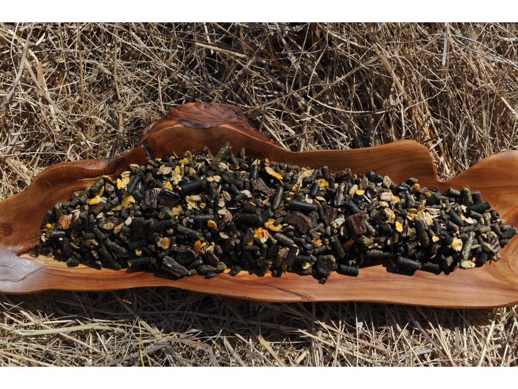 - Obsahuje svatojánský chléb (lusky z rohovníku), který zlepšuje trávení, pozitivně působí na srst, kůži, kopyta a je také cenným zdrojem vápníku i vlákniny a působí jako zchutňovadlo