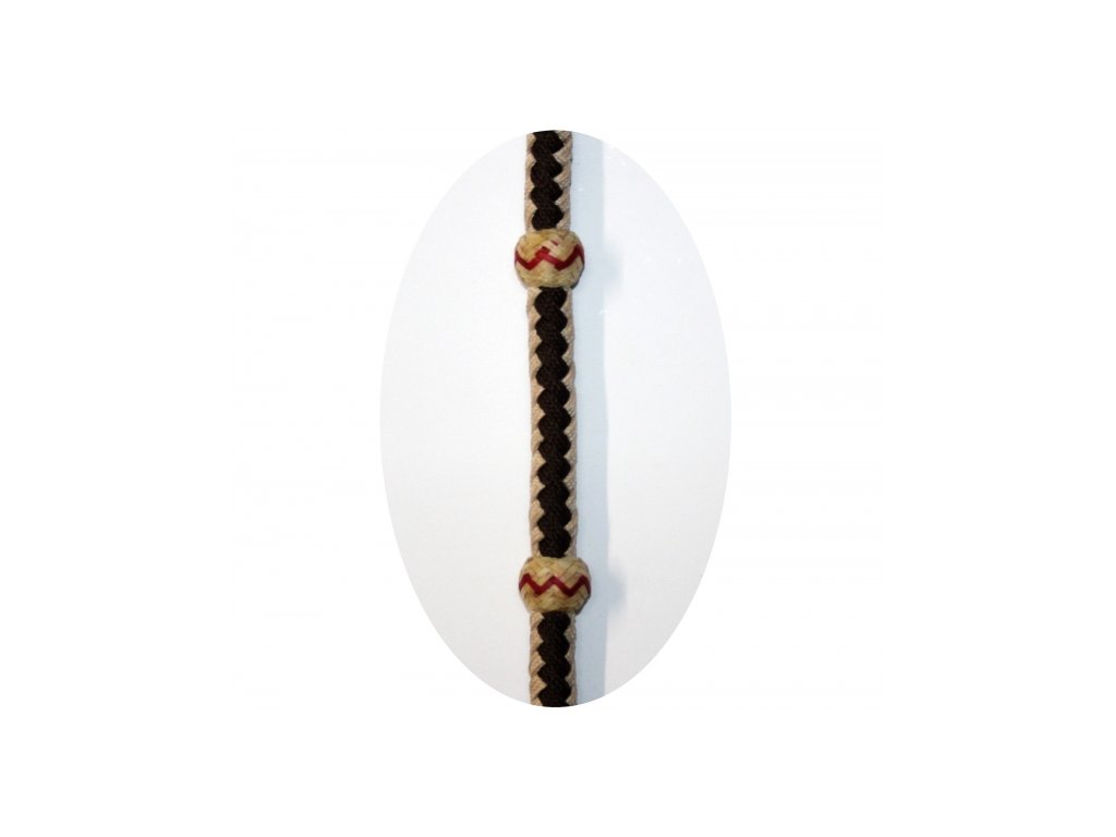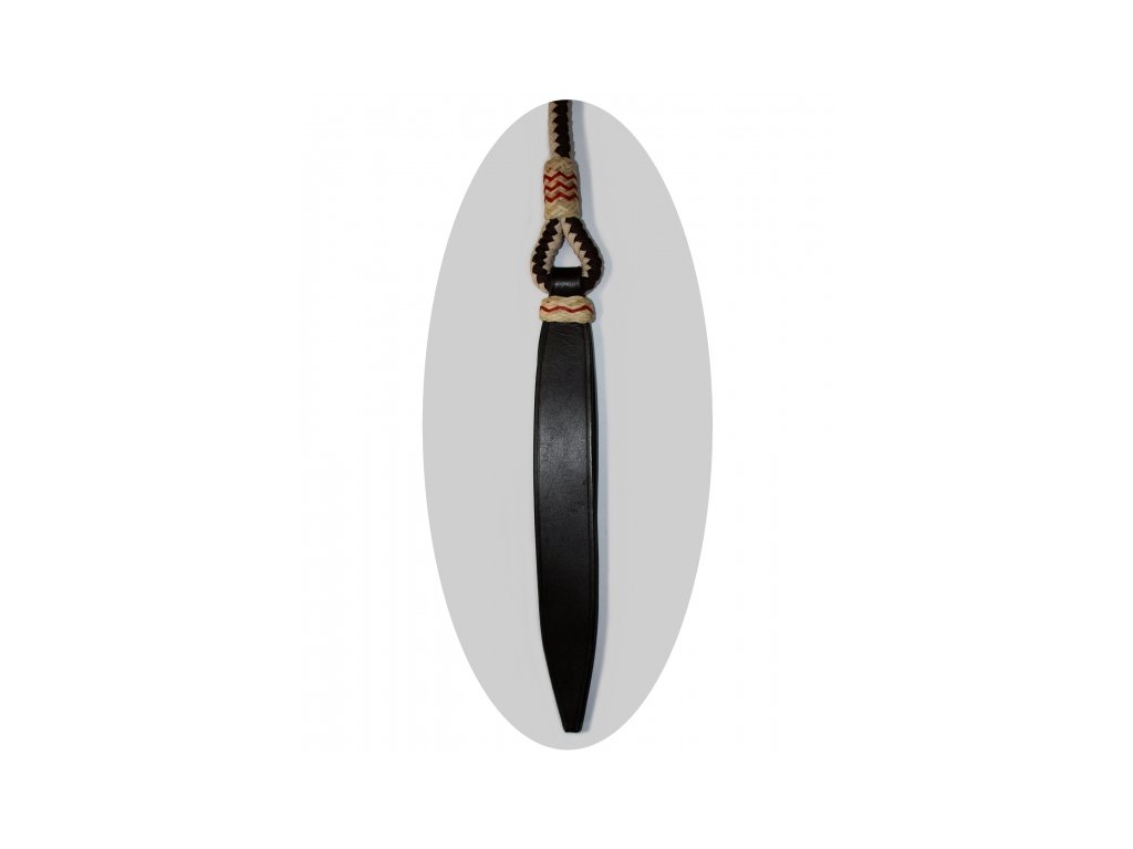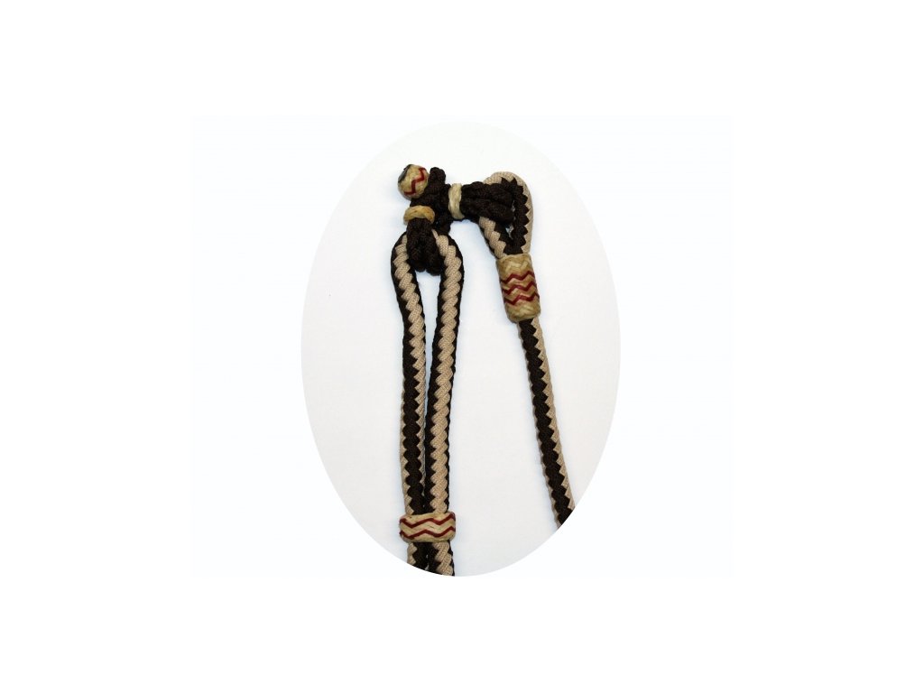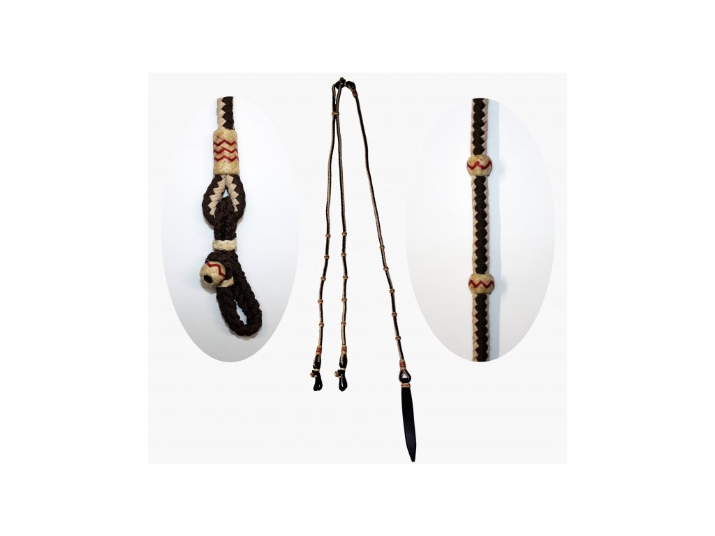 CE Tack nylonový Romal reins, vzorovaný, vícebarevný. Celková délka: cca 313 cm. Délka dvojitého konce: cca 143 cm. Délka jednoduchého konce: cca 170 cm. Délka koženého popperu: cca 29 cm