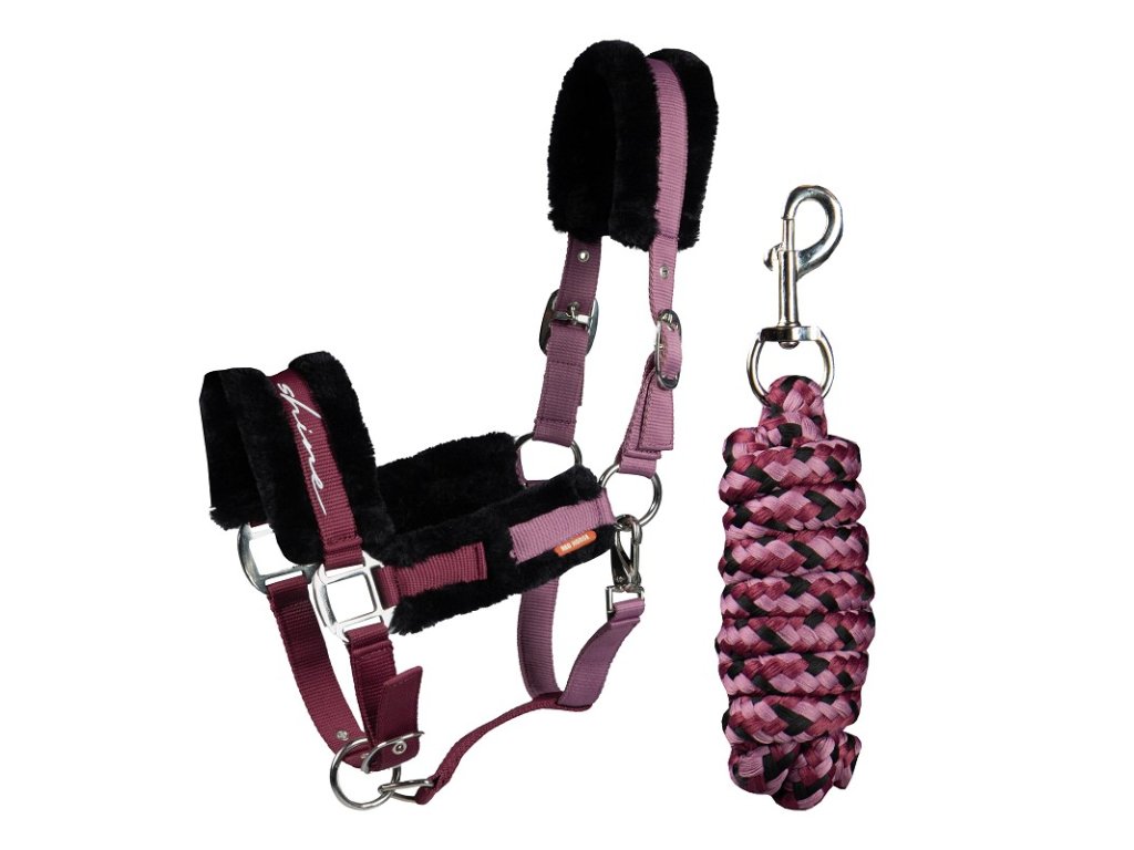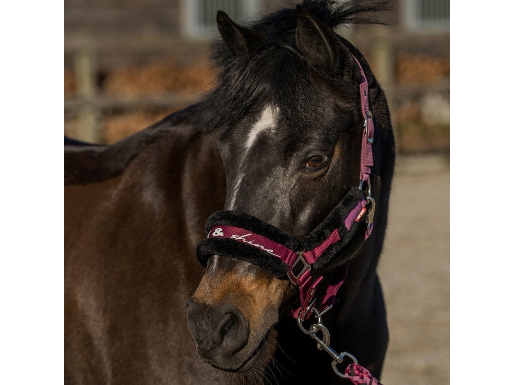 Ohlávka včetně 1,80m dvoubarevného vodítka. Ohlávka je polstrovaná umělou kožešinou a nastavitelná na hlavě a nánosníku.