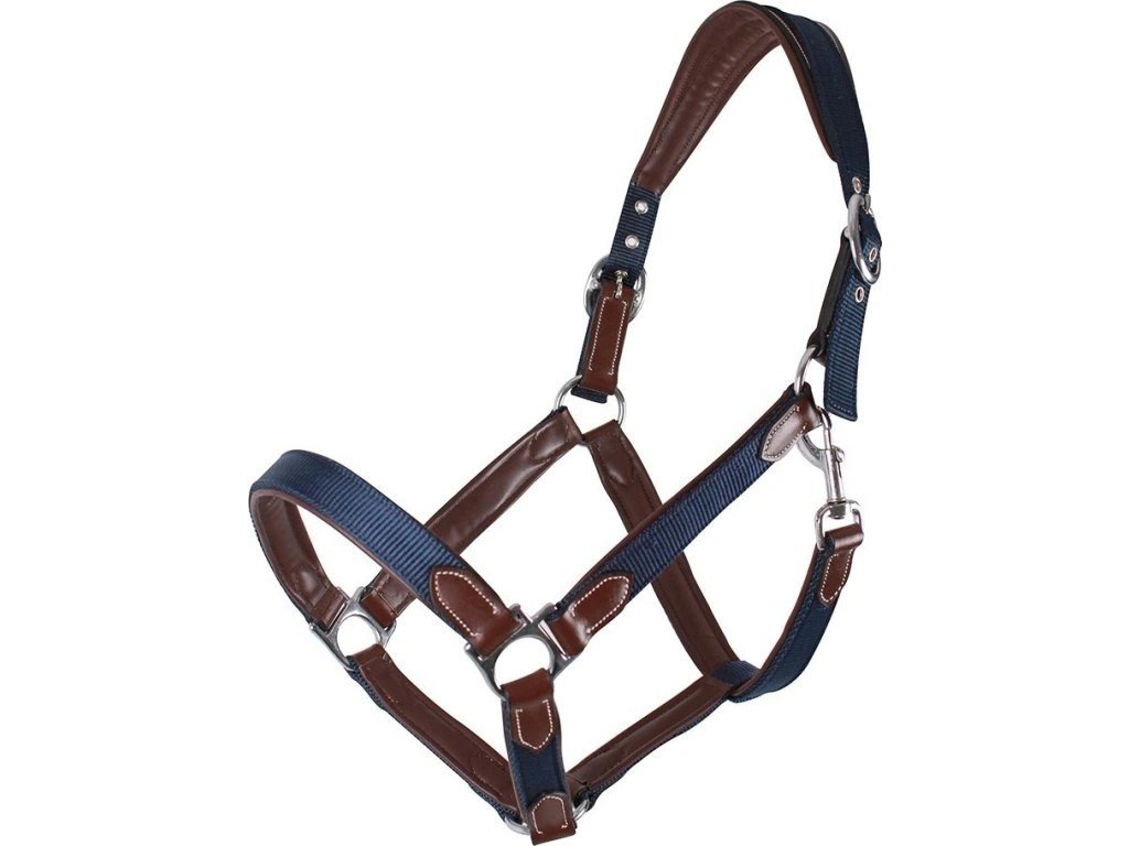 Ohlávka vyrobená z kombinace nylonu a měkké imitace hovězí kůže. Robustní vzhled a provedení s elegantním bílým prošíváním. Nátylník je v širším provedení pro rozložení tlaku za ušima.