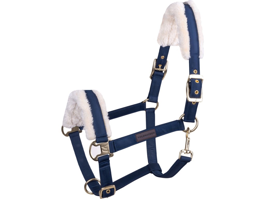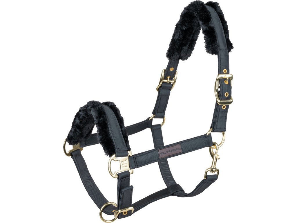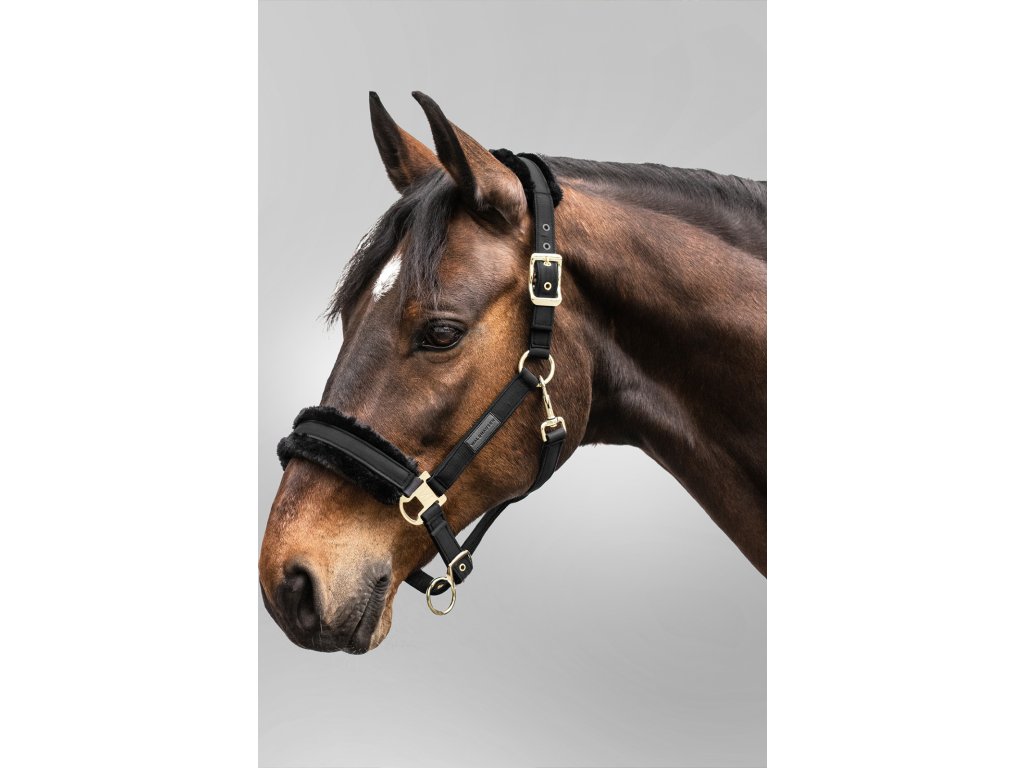 Kvalitní ohlávka s elegantním saténovým potahem. Ohlávka je podšitá syntetickou kožešinou na nosním pásku a nátylníku, poskytuje tak vysoký stupeň pohodlí nositele. S kováním ve zlaté barvě.
