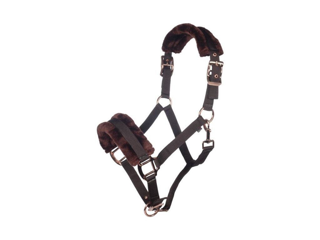 Ohlávka značky HKM s beránkovým podšitím, nastavitelný nánosník a nátylník s obou stran. Kování v barvě rosegold.