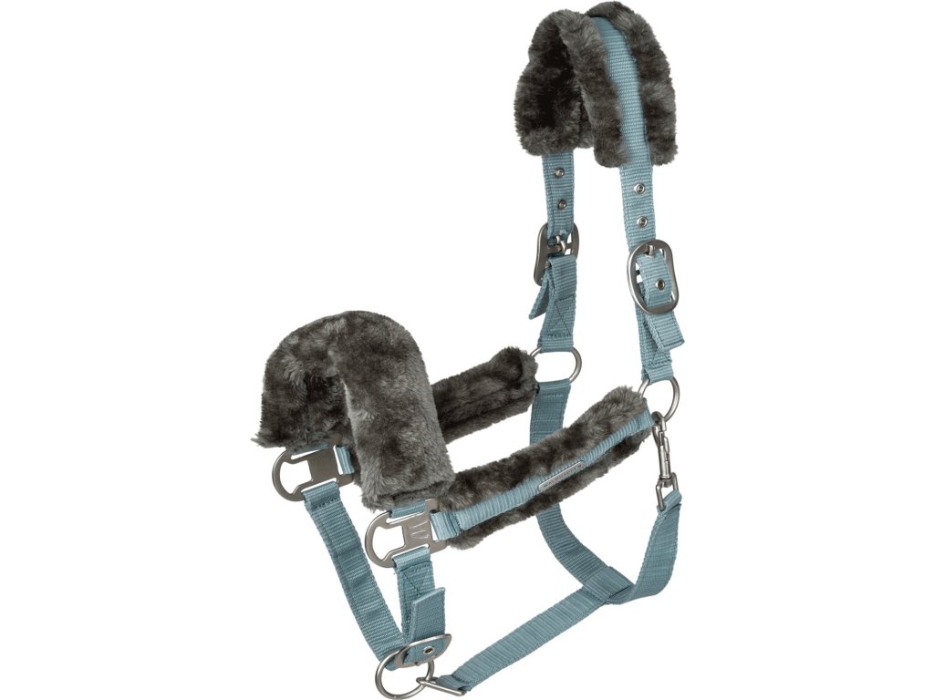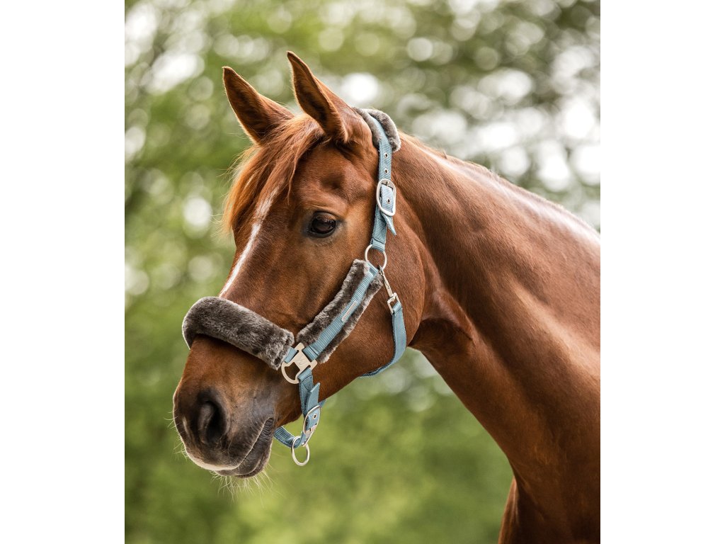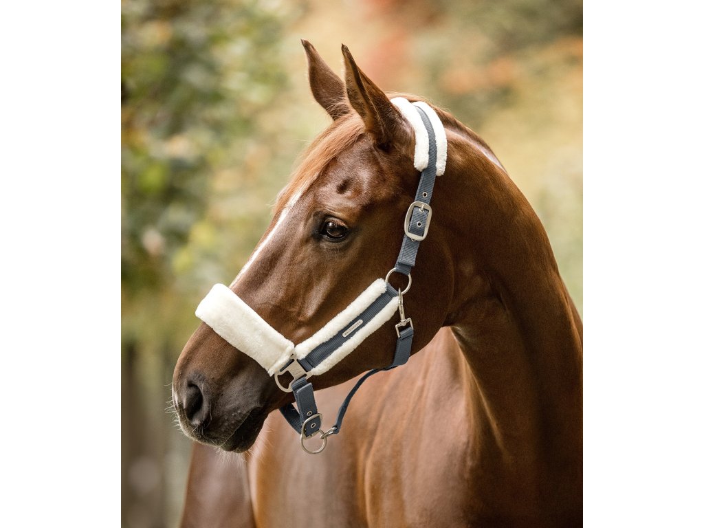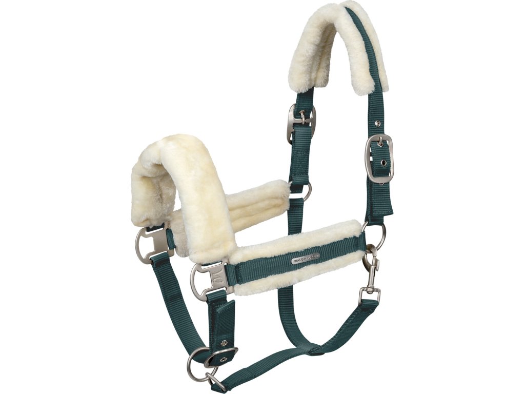 Kvalitní ohlávka s měkkým polstrováním ze syntetické kožešiny na nánasníku, nátylníku a lícnicích. Snadno nastavitelné na podbradním pásku a na obou stranách nánosníku. S matně stříbrným kováním a stříbrným logem Waldhausen.