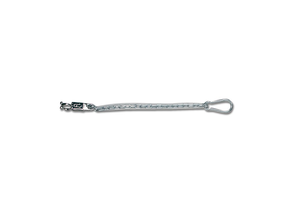 Řetěz potažený čirým PVC, s pružinovým hákem a panikovým hákem.