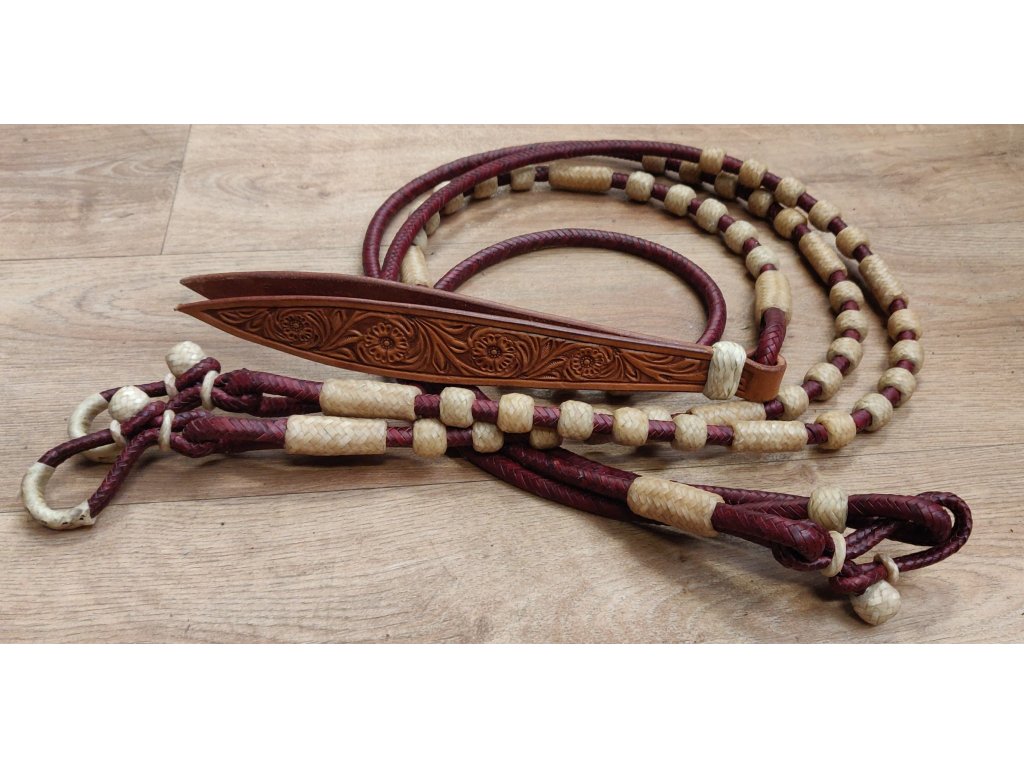 Velmi pružné, hladce pletené Romal reins. Měkká kůže latigo v vínové barvě s pletenými knoflíky z přírodní surové kůže. S koženým popperem.