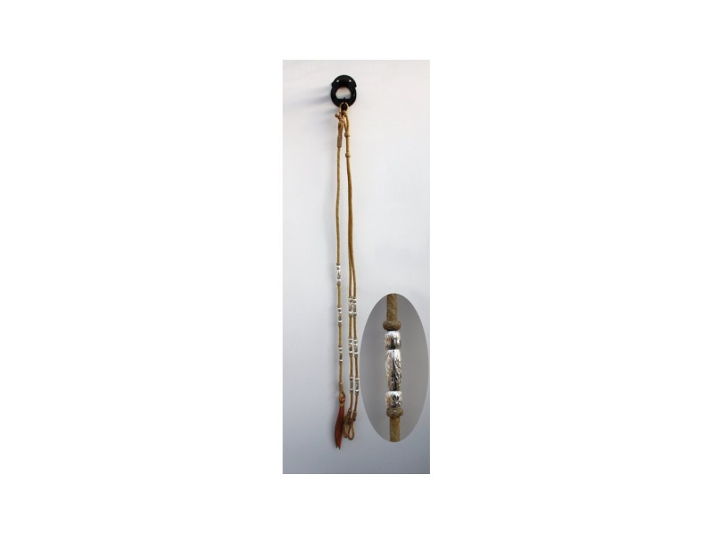 Romal ze surové kůže zdobený stříbrnými válečky.