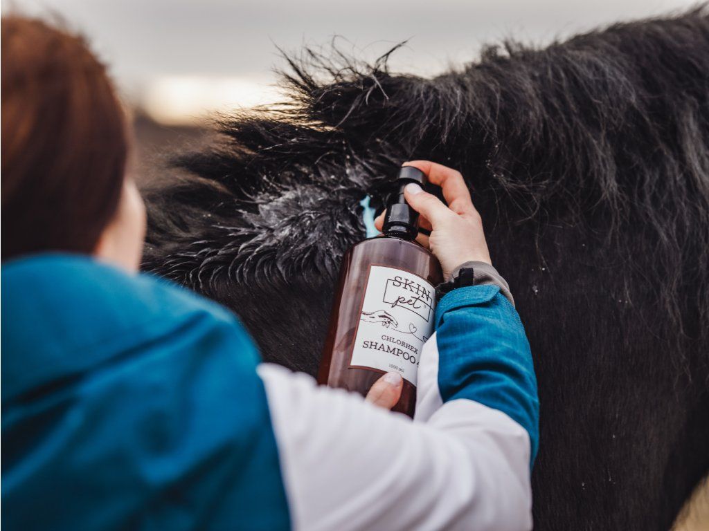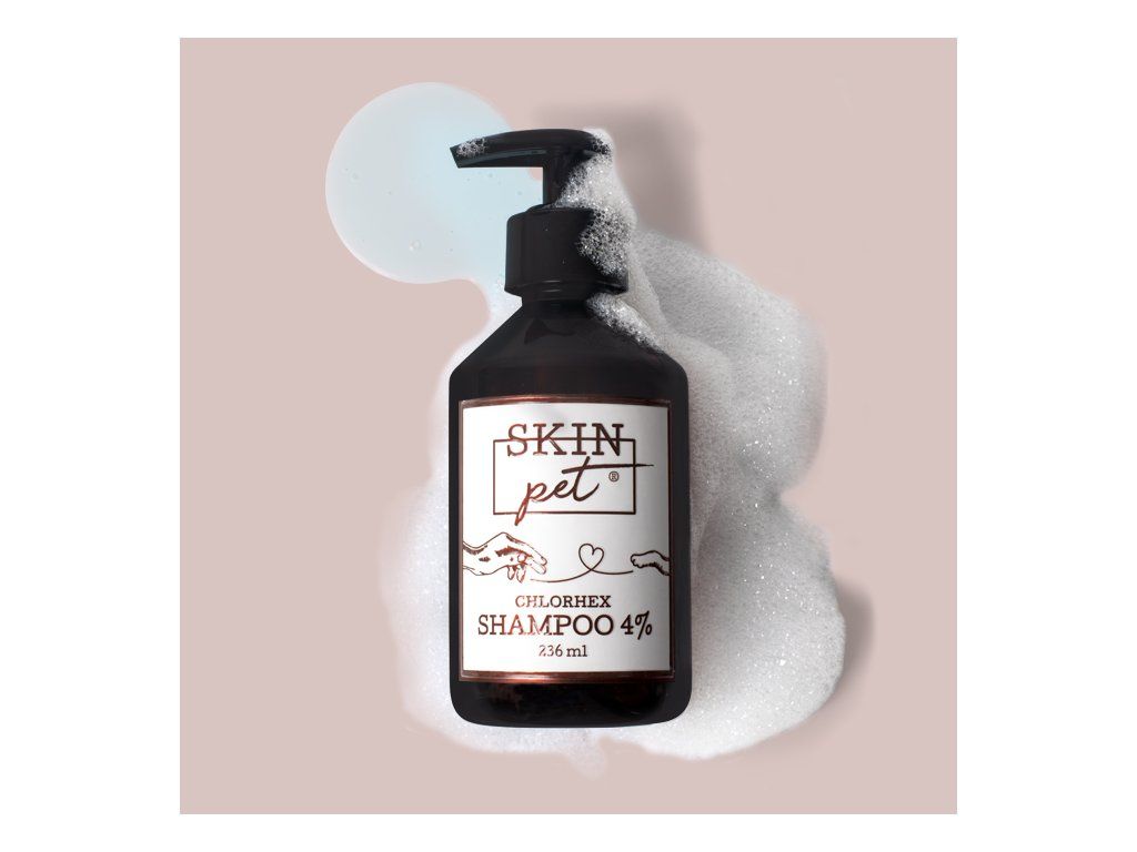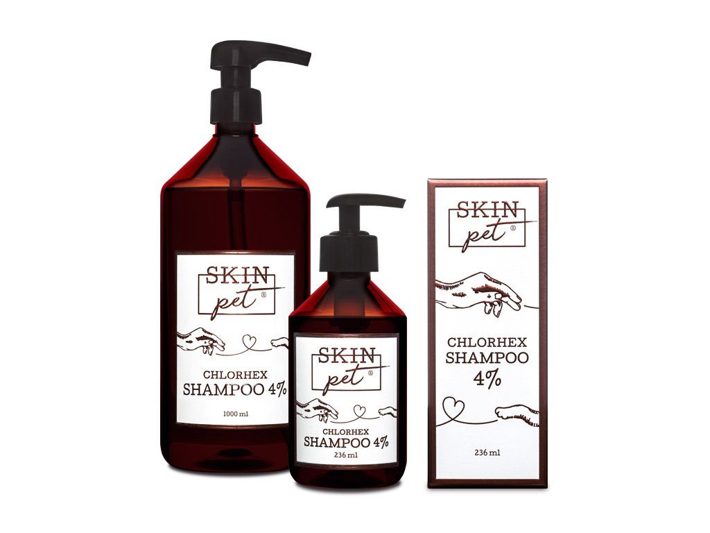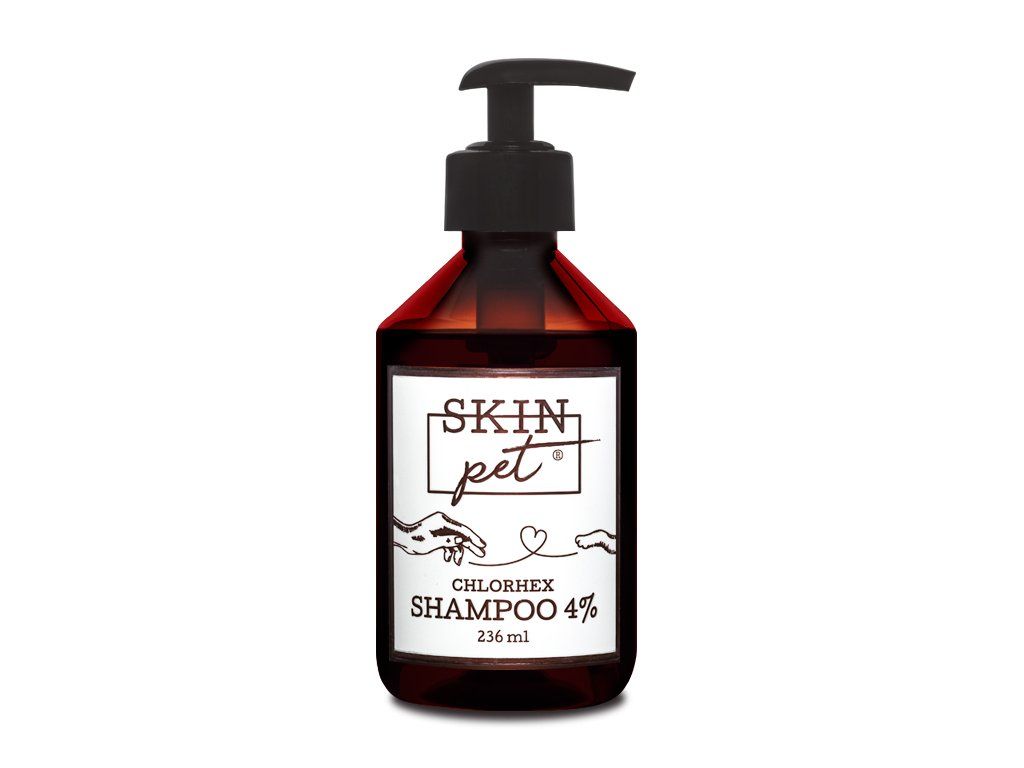 Šampon SkinPET Chlorhex Shampoo 4% – Brání průniku patogenních organismů a vzniku infekce po operacích, úrazech nebo při infekcích kůže a jiných kožních potížích. Šampon šetrně čistí, eliminuje zápach a navrací srsti přirozený lesk.
