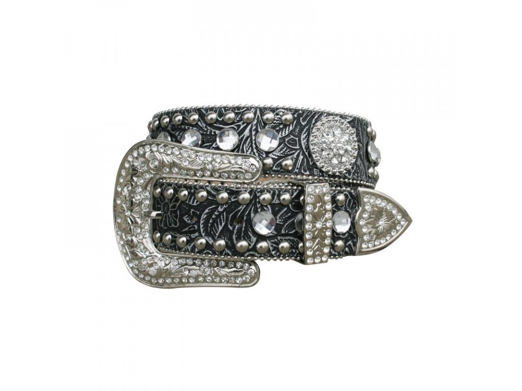 Černý show pásek s krásným květinovým vzorem. Kování a kameny s květinovým vzorem, jednotlivými kamínky a nýty.