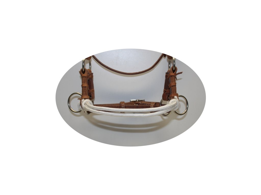 Kožený sidepull ve světle hnědé barvě a nánosníkem z tenkého provazu.