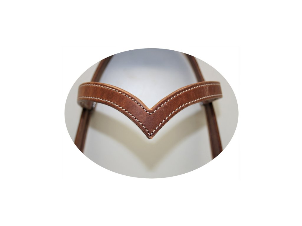 Kožený sidepull ve světle hnědé barvě, s čelenkou do tvaru V a nánosníkem s tenkého bílého dvojného provazu