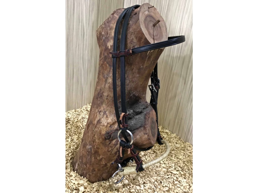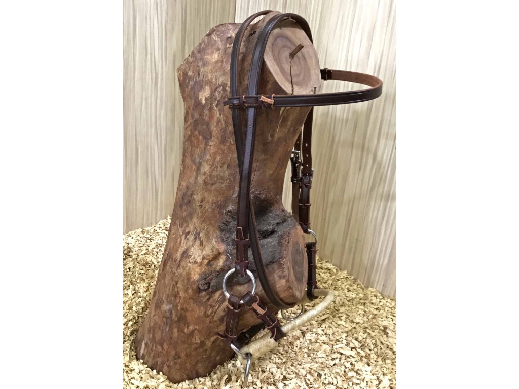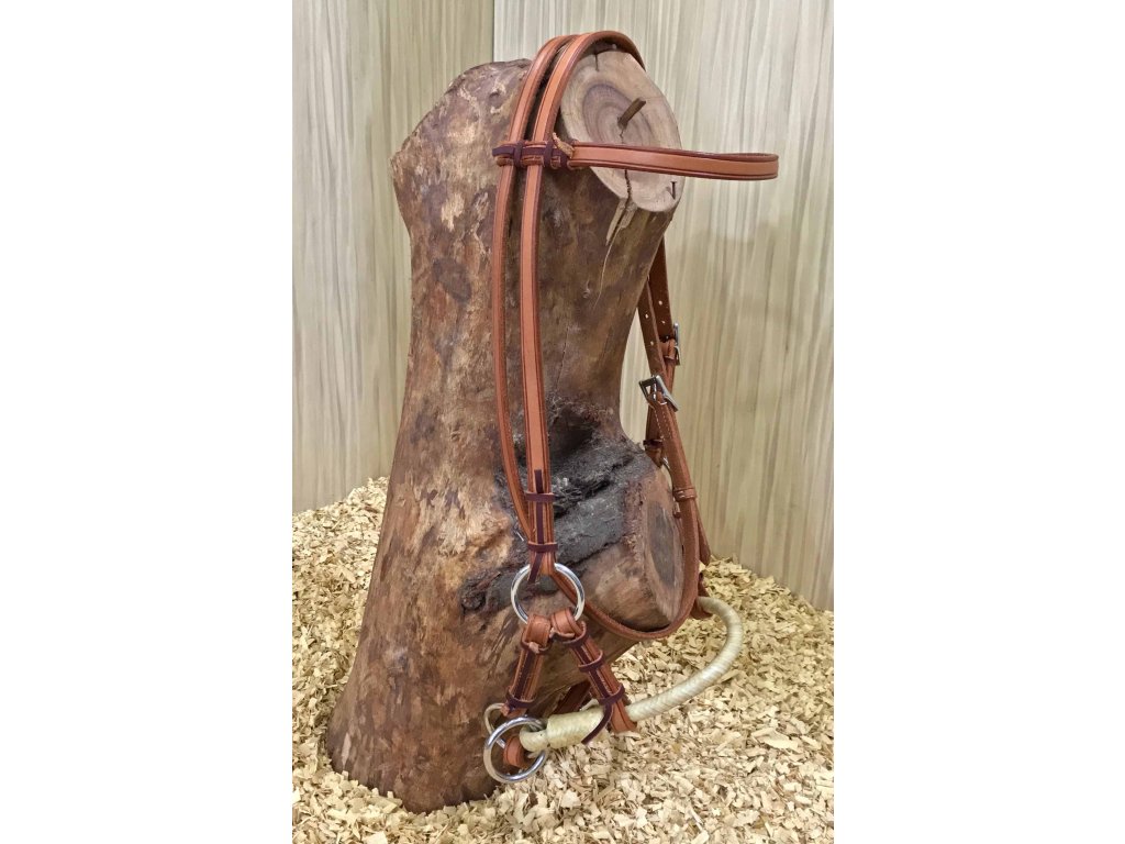 Kvalitní kožený sidepull s kulatým nánosníkem z rawhide. Nerezové kování. Velikost QH. Bez otěží.