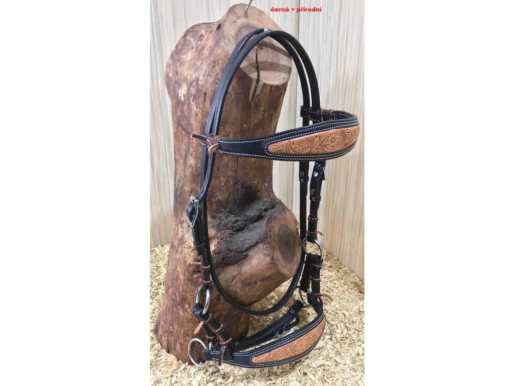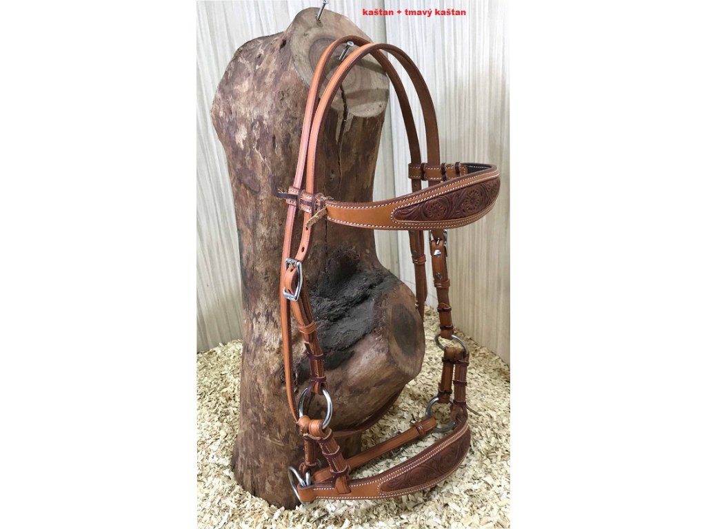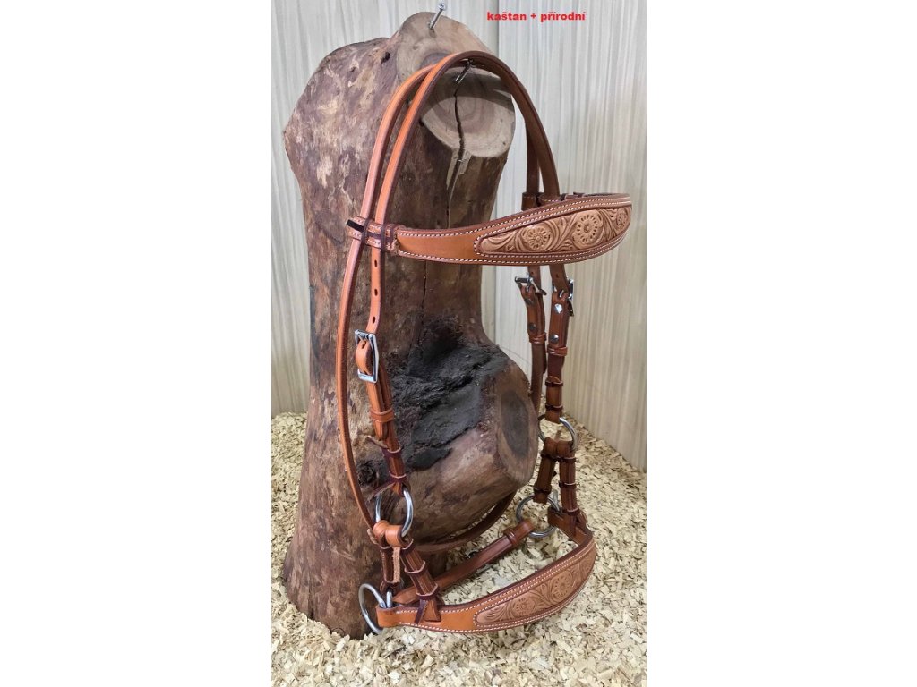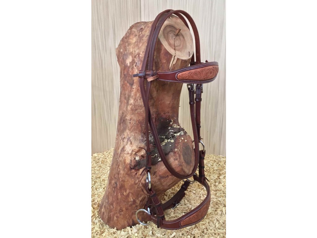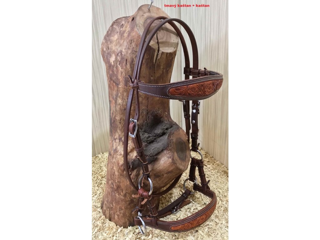 Kvalitní kožený sidepull s rozšířenou čelenkou a nánosníkem. Dvoubarevná kůže zdobená květinovou rytinou. Velmi jemné bezudidlové uždění. Bez otěží. Velikost QH.