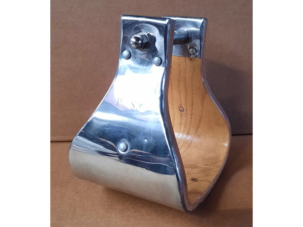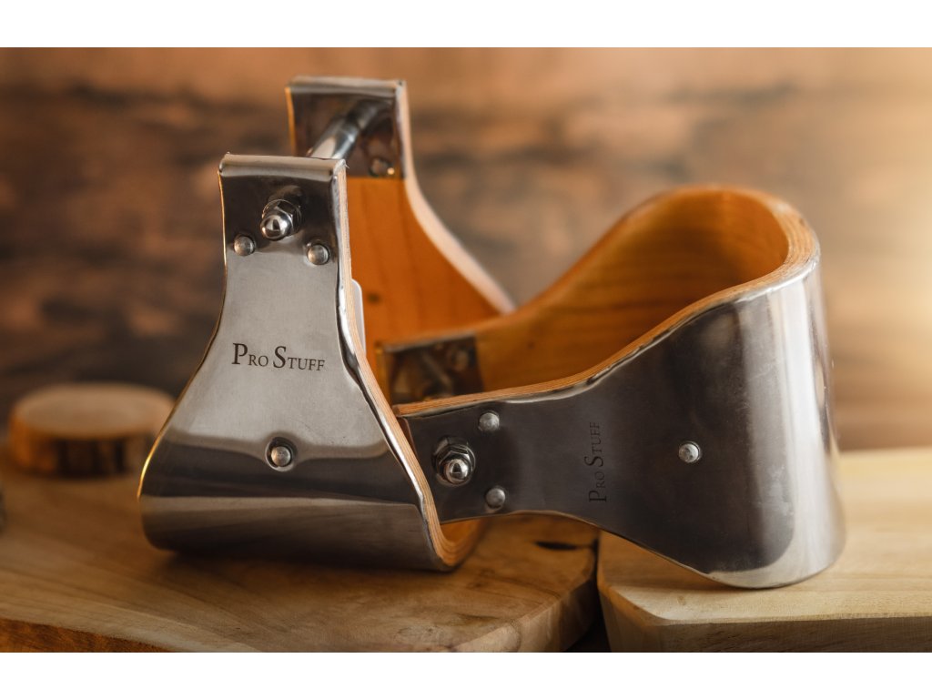 Buckaroo třmeny z hliníku s nášlapem z jasanového dřeva. Extra široké provedení (10 cm) – ideální i pro velkou a širokou pánskou nohu, patří k nejširším třmenům na trhu.