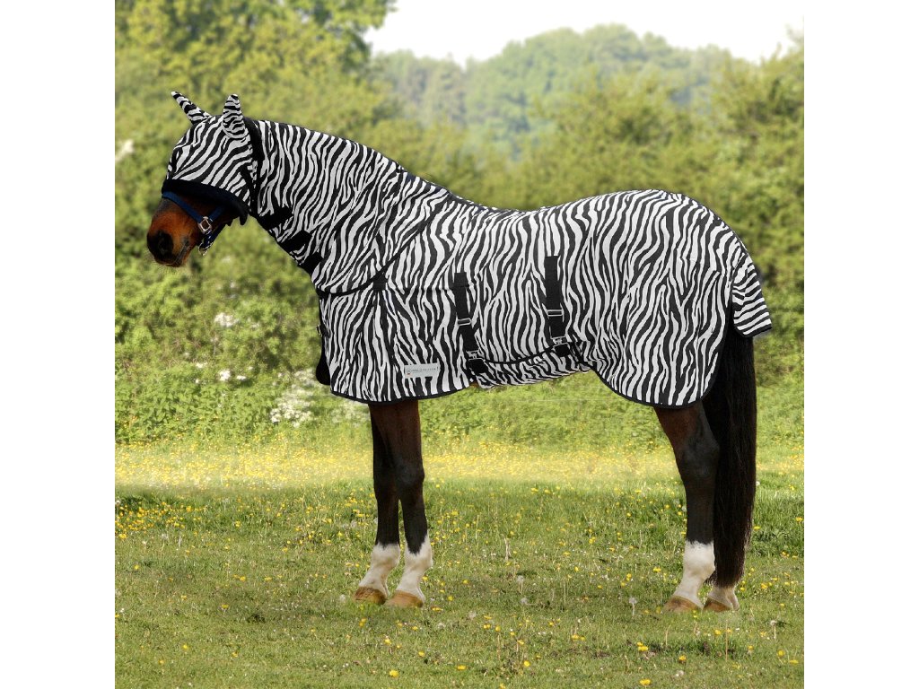 Deka na koně se vzorem zebry, který sám o sobě je pro hmyz nepříjemný. Deka poskytuje maximální ochranu díky podbřišnímu laclu.