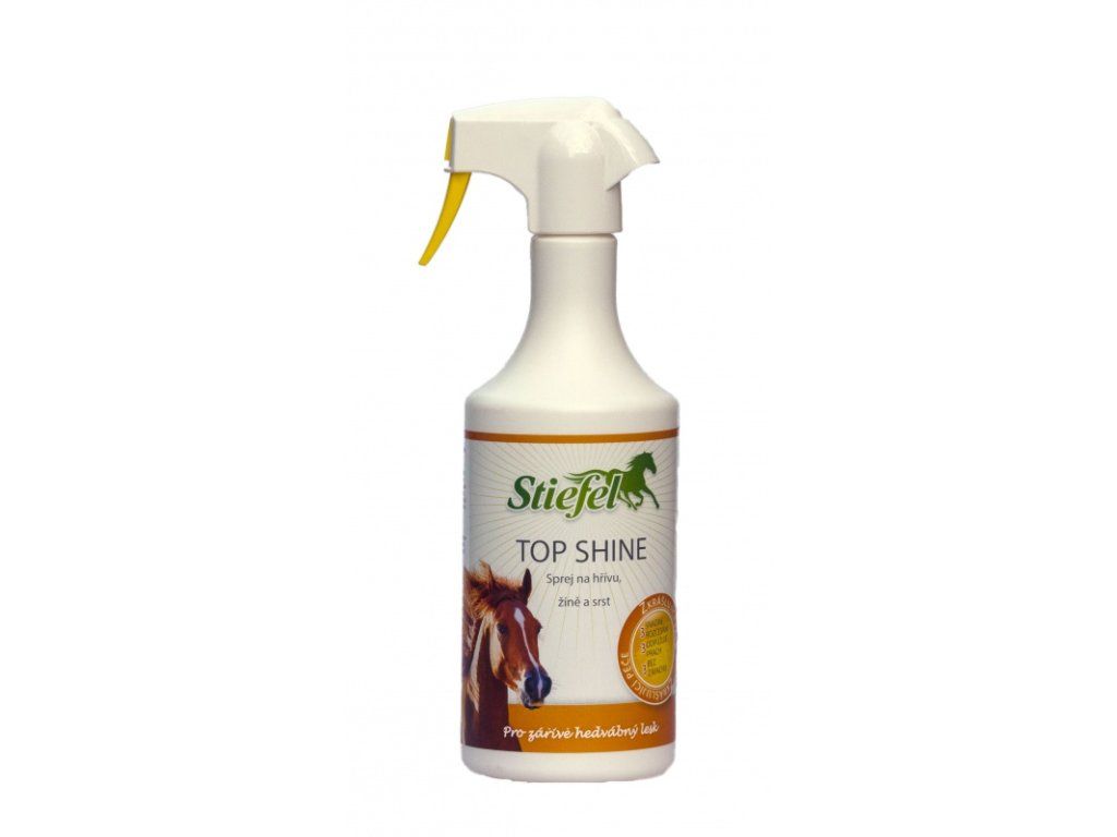 Stiefel Top Shine – kvalitní lesk a rozčesávač pro srst, hřívu a ocas. Hřívu a ocas lze snadněji kartáčovat a rozčesávat, usnadňuje vyčesání zacuchaných žíní. Neviditelný ochranný film obalující každý chlup odpuzuje prach a špínu a brání opětovnému zacuchání hřívy a ocasu. Srst získá hedvábný lesk. Zlepšuje standart péče o srst.