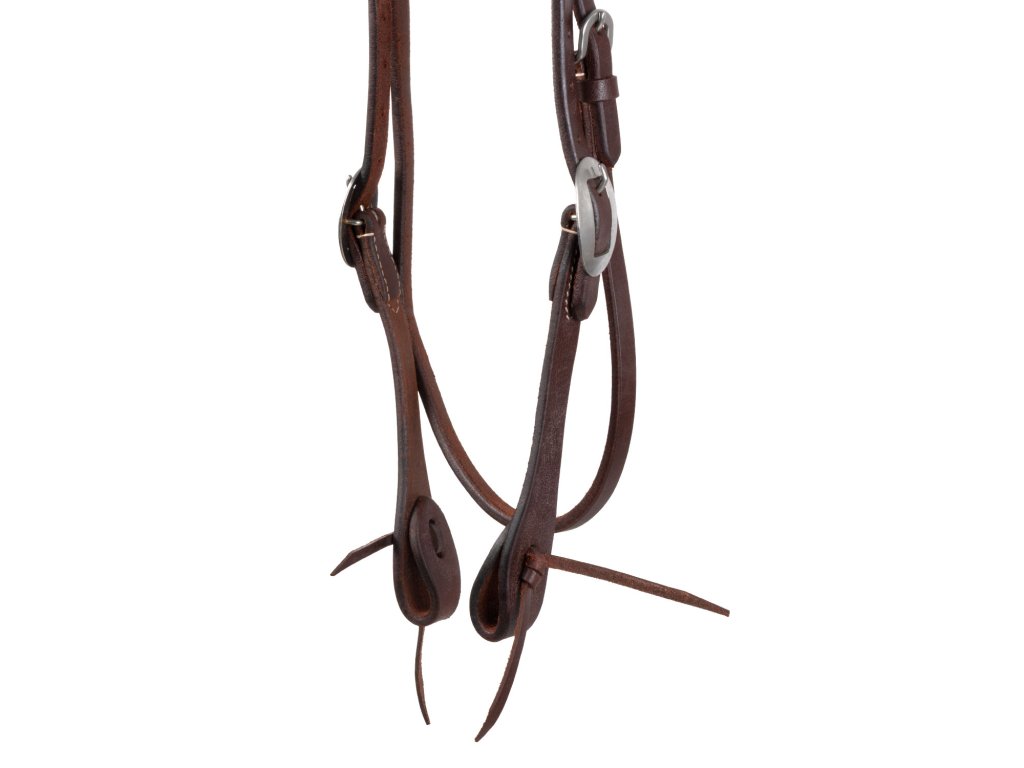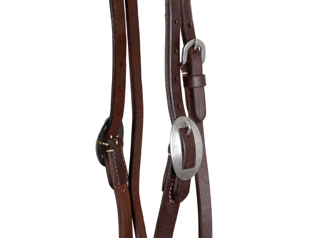 Kožená westernová uzdečka se stříbrným kováním a uzlíkovou čelenkou, která je bíle prošitá. Vyrobena z kvalitní olejované kůže, se zapínáním udidla na šňůrky. Dodáváno bez otěží.
