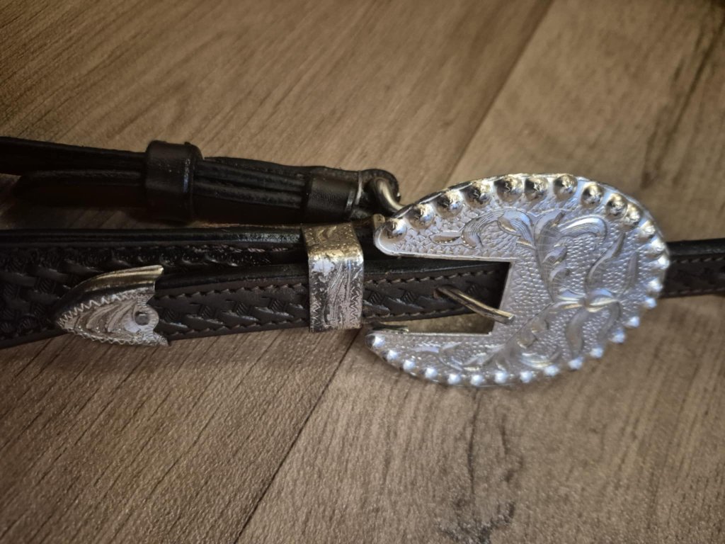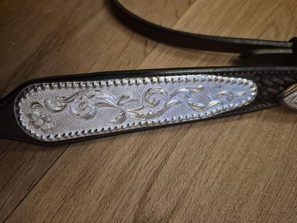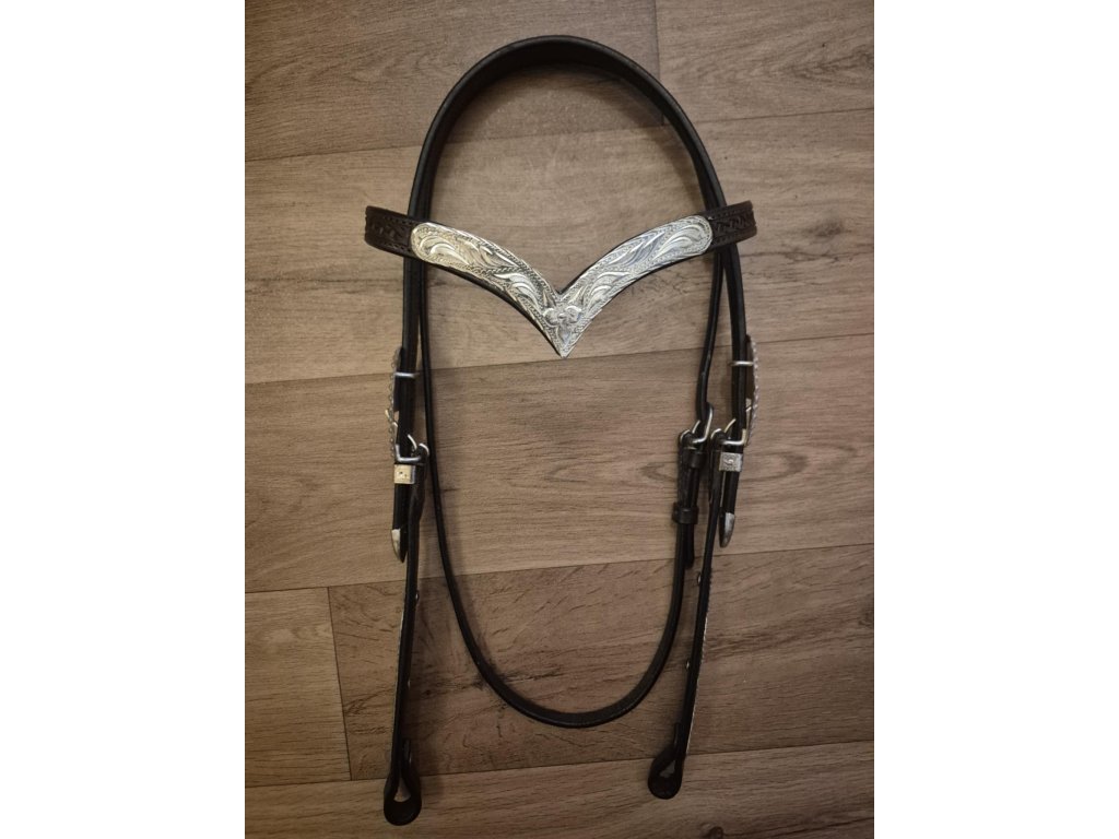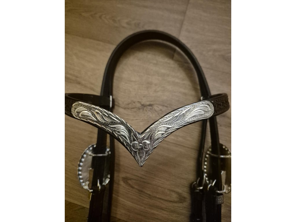 Výrazně zdobená uzdečka s podhrdelníkem a čelenkou do V, kovové postříbřené plíšky mohou vykazovat lehkou patinu. Velikost pro QH a podobné typy koní