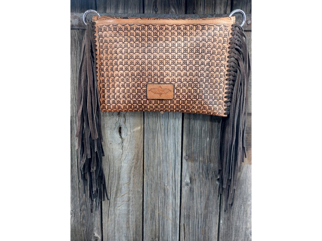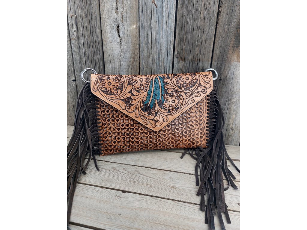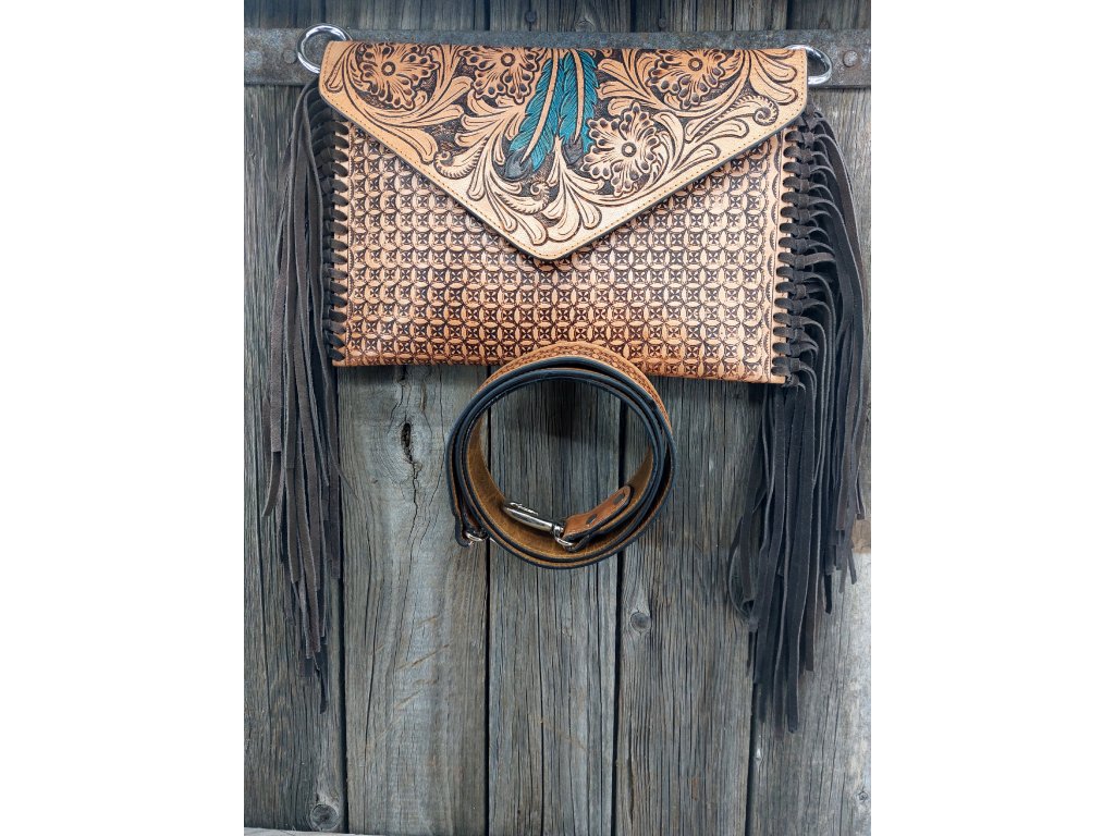Luxusní boho/western kožená kabelka od Stars & Stripes s ručně propracovanou rytinou na hovězí kůži! Odnímatelný ramenní popruh. Kožené třásně dodávají kabelce styl.