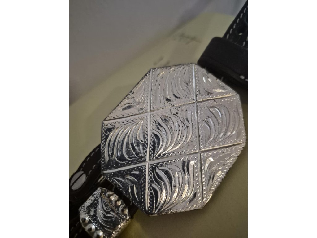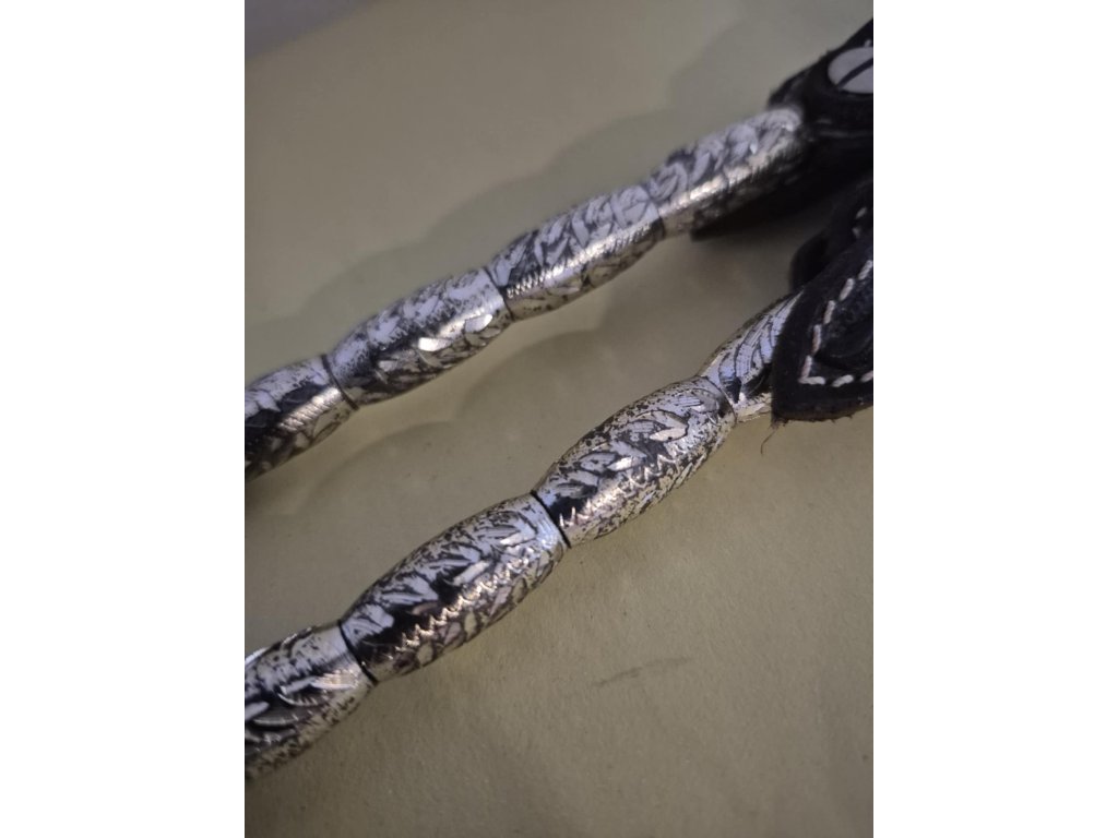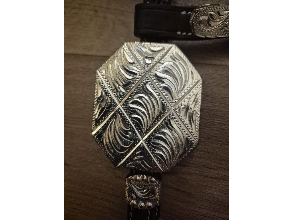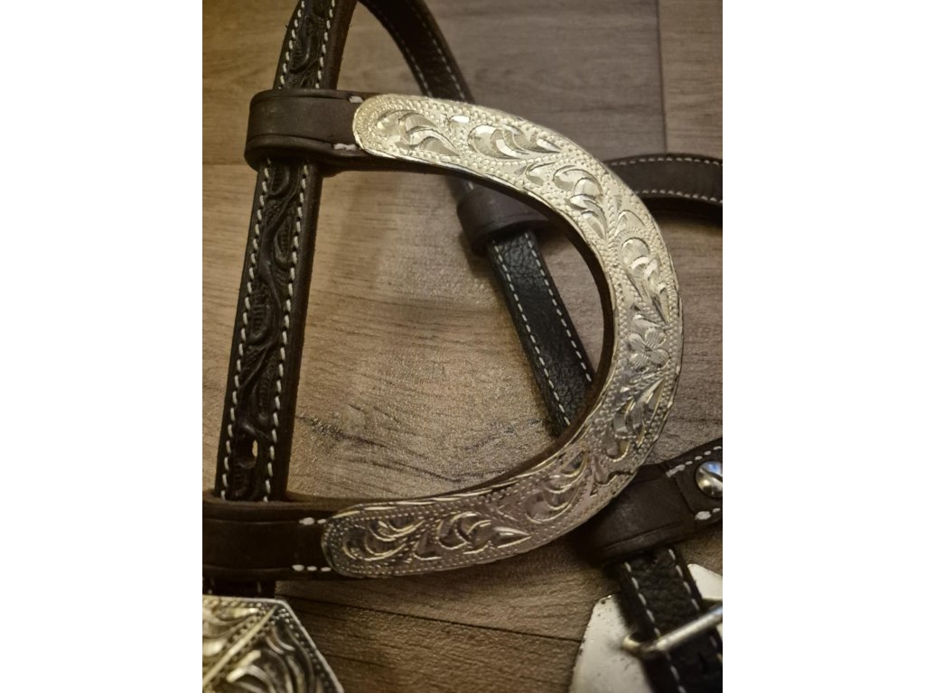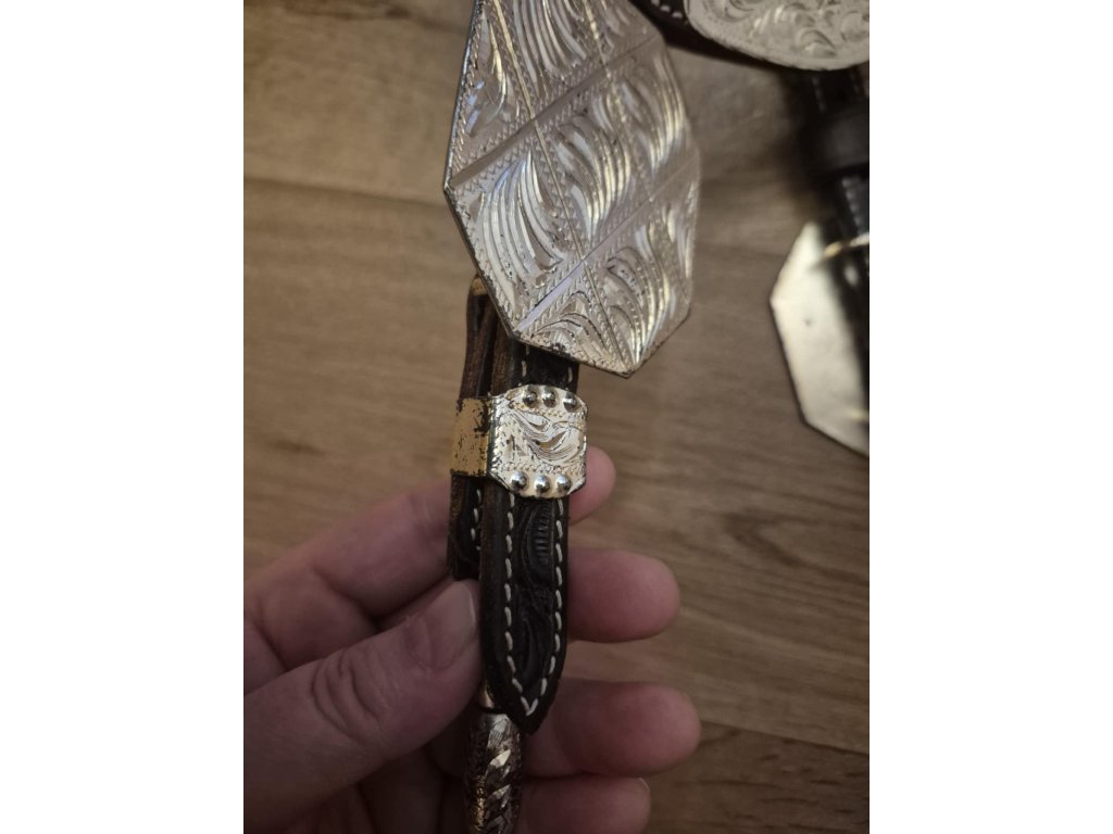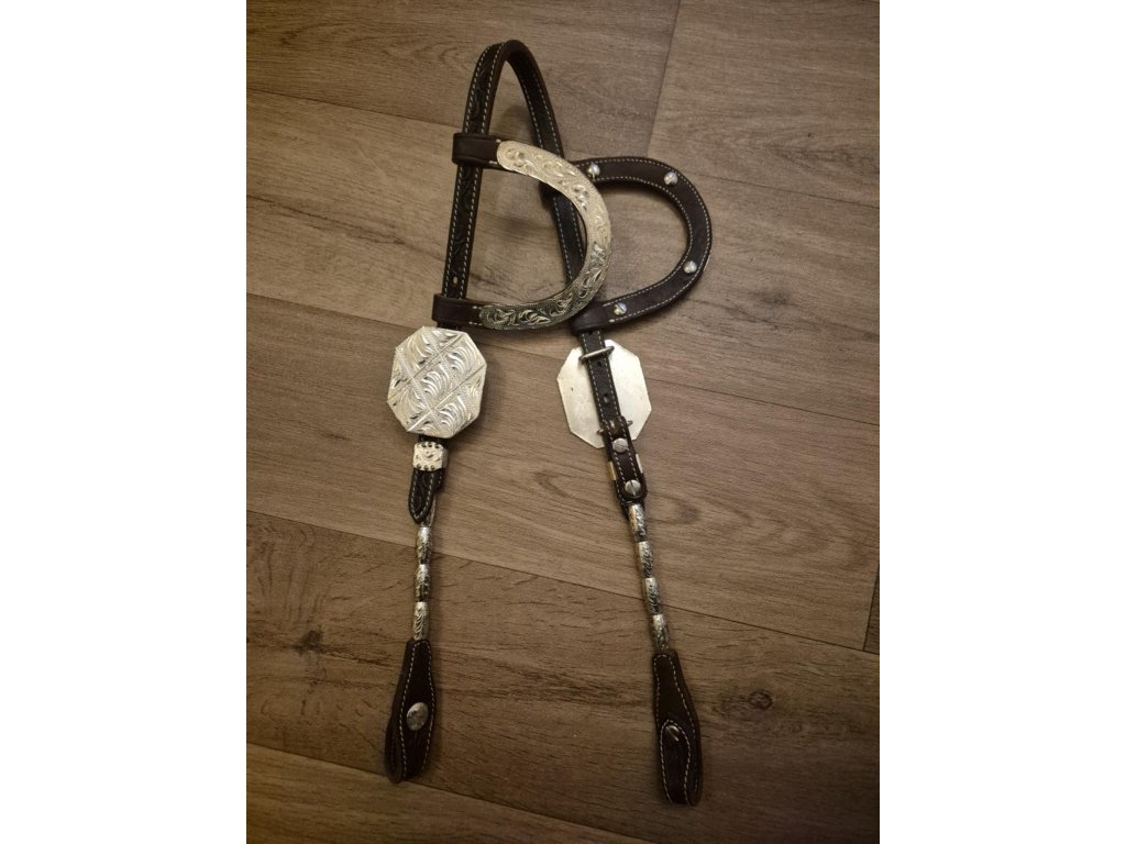 Kožená uzdečka vhodná na jakoukoliv show s výrazným kovovým zdobením s postříbřením, které je ale místy poškrábané a nebo omakané a působí jako s "patinou". Vše je nafoceno v galerii. Velikost pro QH a podobné koně.