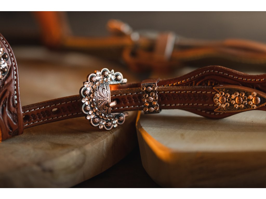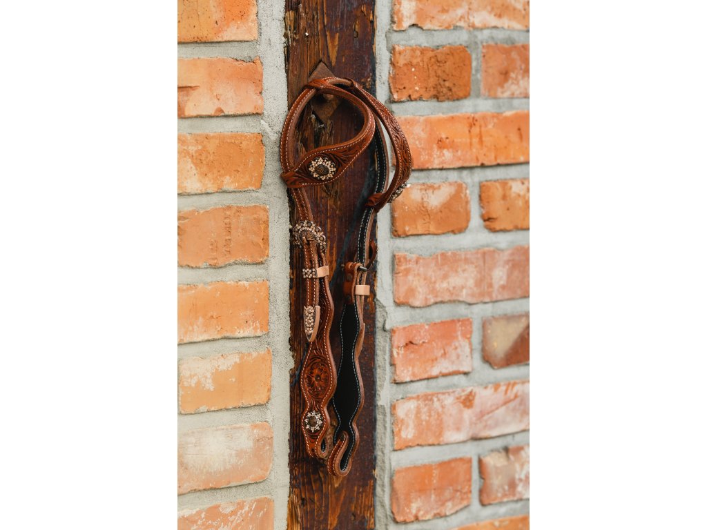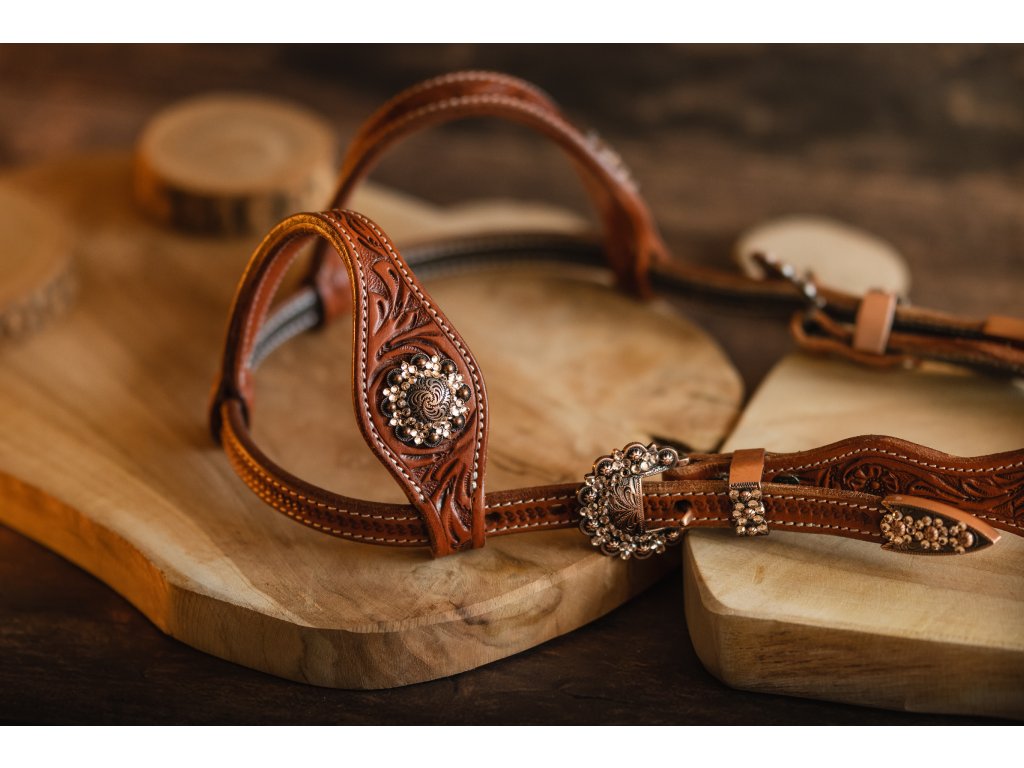 Westernová uzdečka dvouuška s měděnými doplňky a kamínkovými conchi.