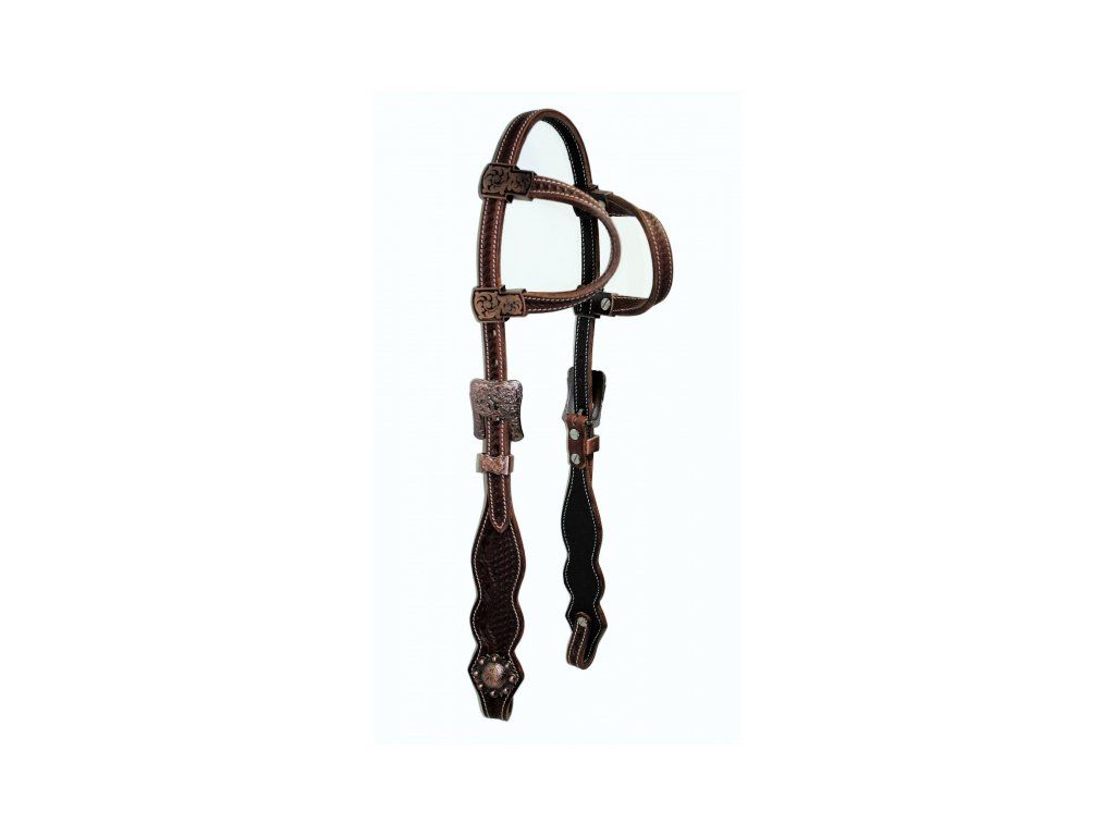 Luxusní westernová uzdečka dvouuška s anatomickým tvarováním vás osloví krásným zpracováním a především kombinací tmavě a světle hnědé barvy. Ozdobné přezky jsou laděné do měděné barvy.