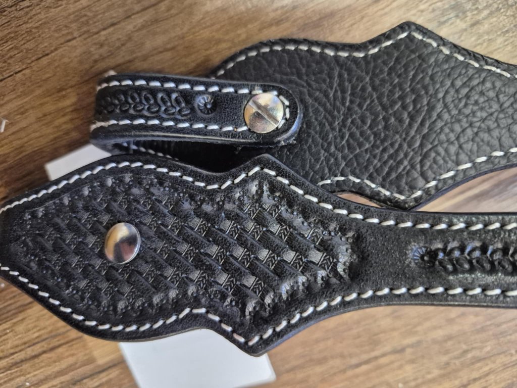 Westernová dvououšková uzdečka vyrobená z kvalitní, pevné kůže, která zajišťuje dlouhou životnost i pohodlí pro koně. Uzdečka je bohatě zdobená tradiční westernovou ražbou a efektními kamínky, které jí dodávají elegantní a výrazný vzhled. Kontrastní prošívání podtrhuje precizní ruční zpracování.