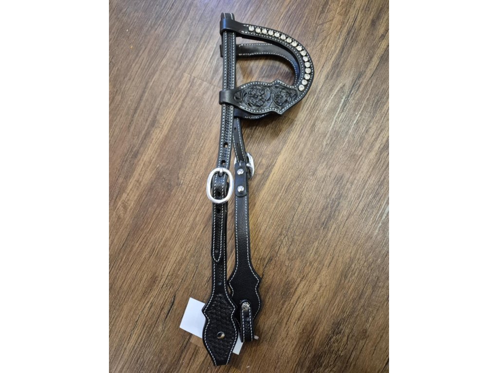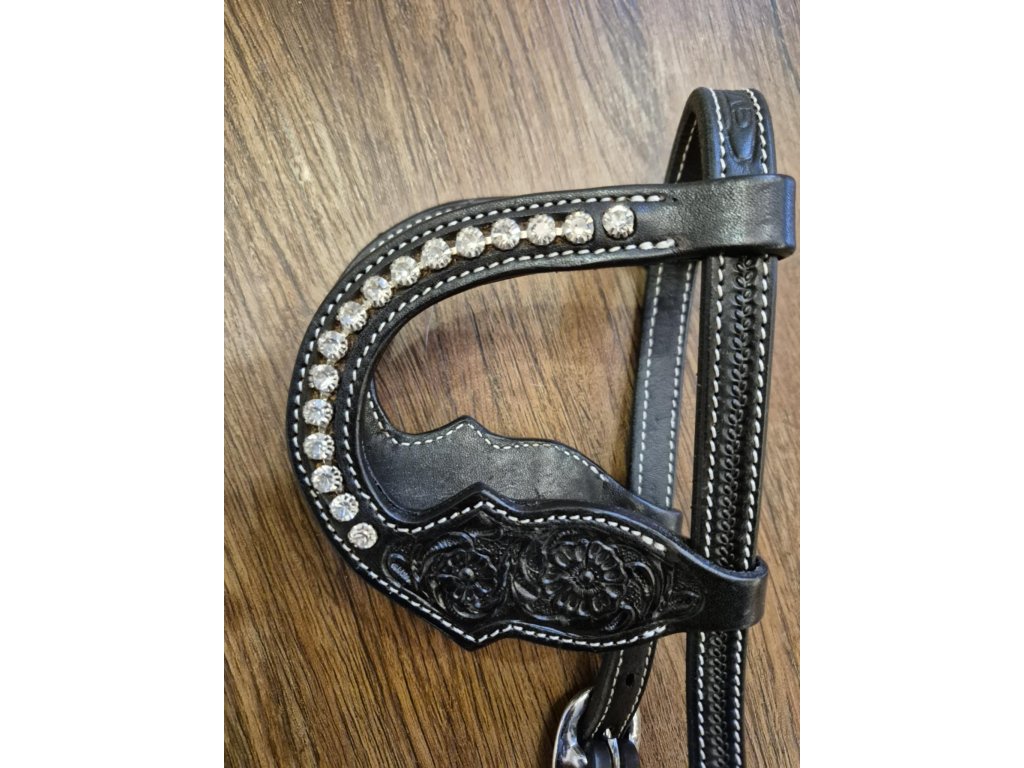 Stylová westernová dvououšková uzdečka z kvalitní kůže, zdobená ražbou a kamínky. Precizní zpracování, nastavitelná velikost a výrazný westernový vzhled.