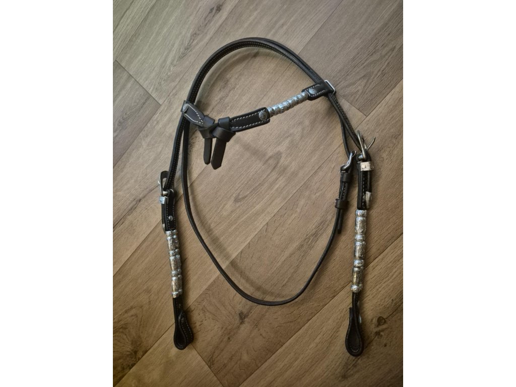 Westernová uzdečka s korálky stříbrné barvy, tmavě hnědá