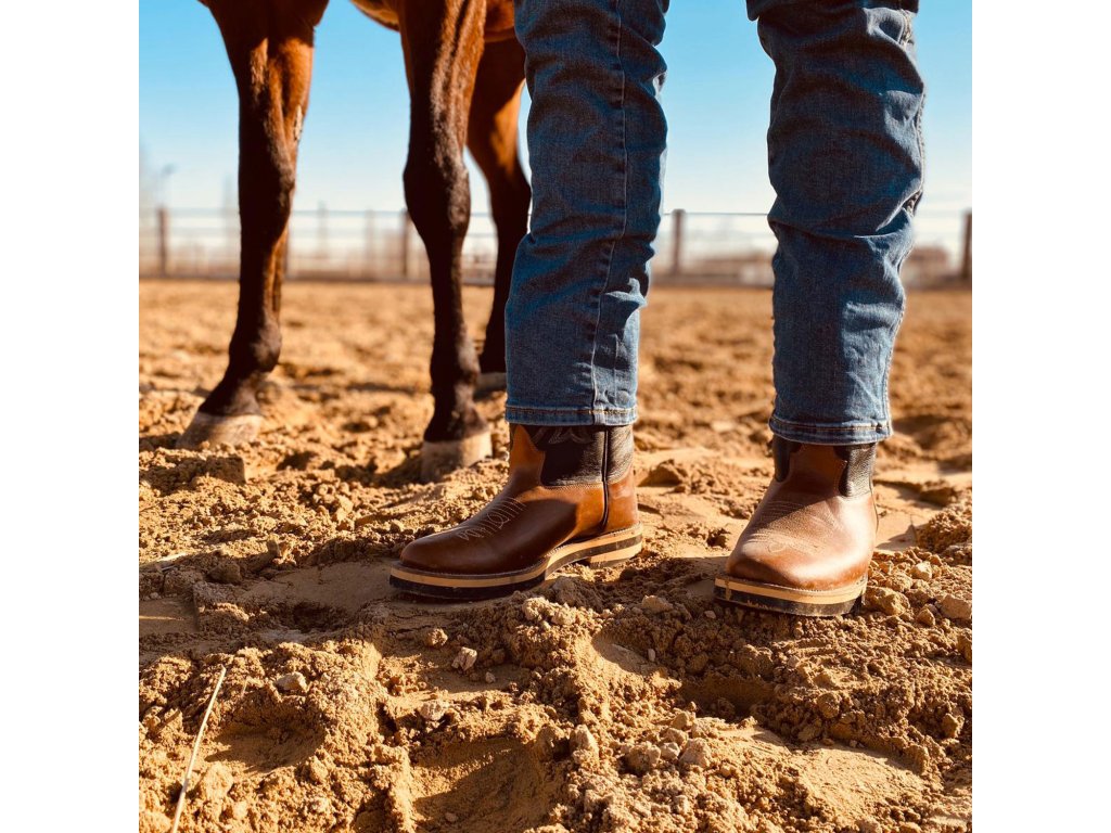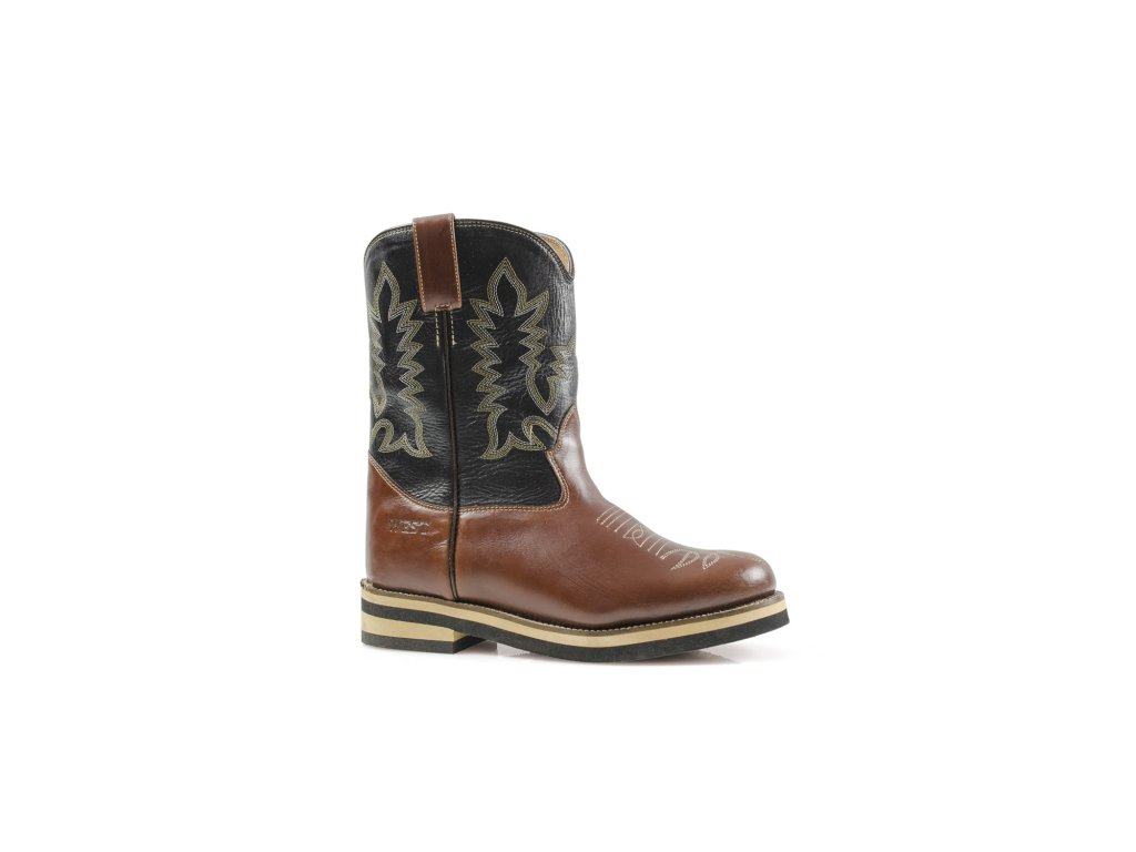 Nízké westernové boty s kulatou špičkou. Vyrobeny z měkké hnědé kůže, dvoubarevný design s vyšívaným vzorem holeni. Komfortní a pohodlné westernové boty s gumovou podrážkou.