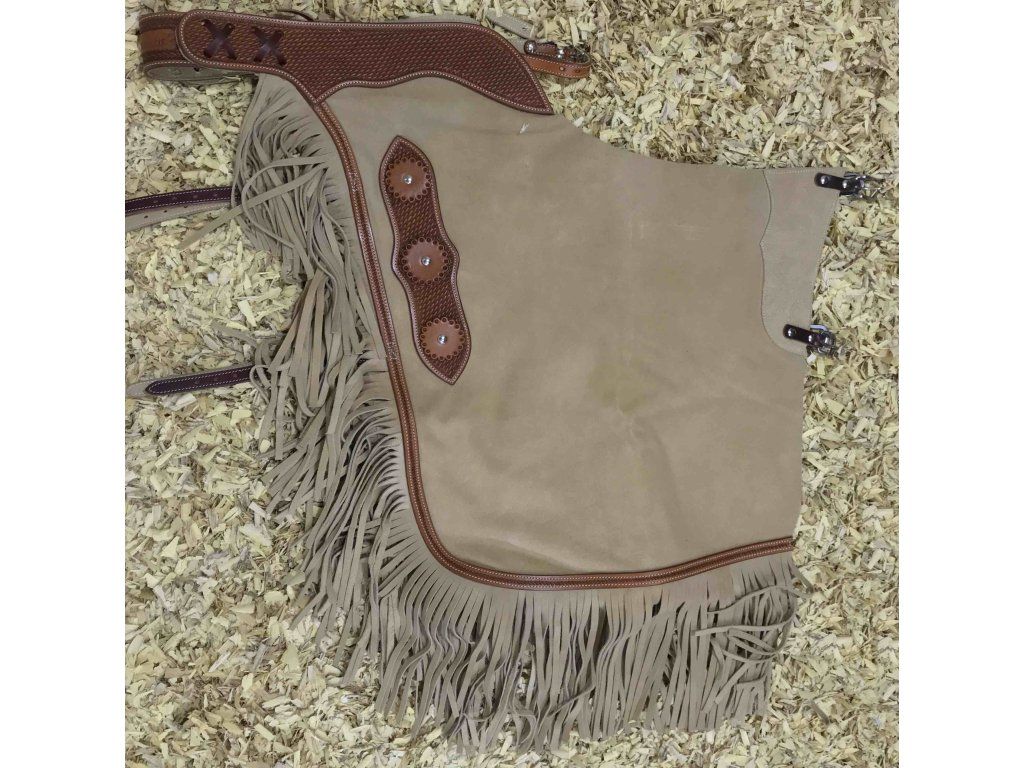 Westernové chink chaps ze semišové kůže. Zdobené v pase toolingem, kůže značky Wickett & Craig. Přezka nohavic je na vnitřní straně. K dostání ve dvou velikostech: small a normal.