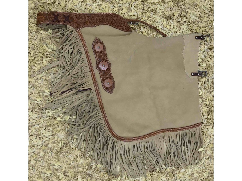 Westernové chink chaps ze semišové kůže. Zdobené v pase toolingem, kůže značky Wickett & Craig. Přezka nohavic je na vnitřní straně. K dostání ve dvou velikostech: small a normal.