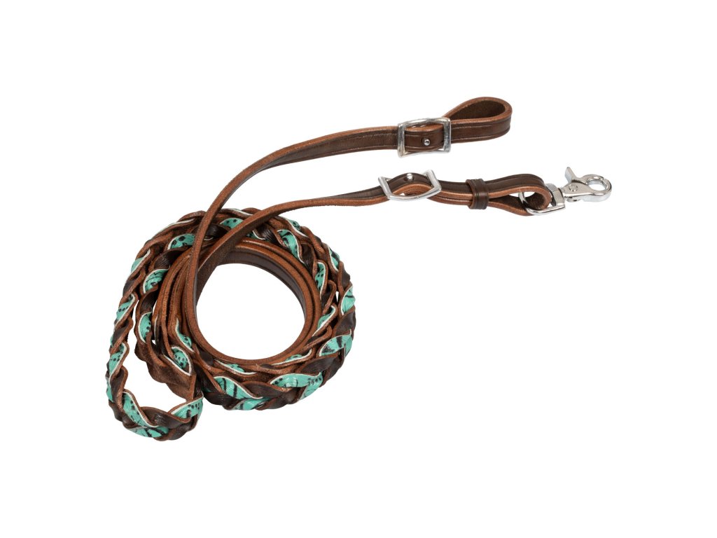 Westernové otěže vyrobené z vysoce kvalitní měkké kůže a zdobené tkaným vzorem po celé délce. Přezky jsou vyrobeny z nerezové oceli, aby byla zajištěna maximální pevnost a bezpečnost a také neuvěřitelná odolnost v průběhu času. Karabinka není součásti balení.