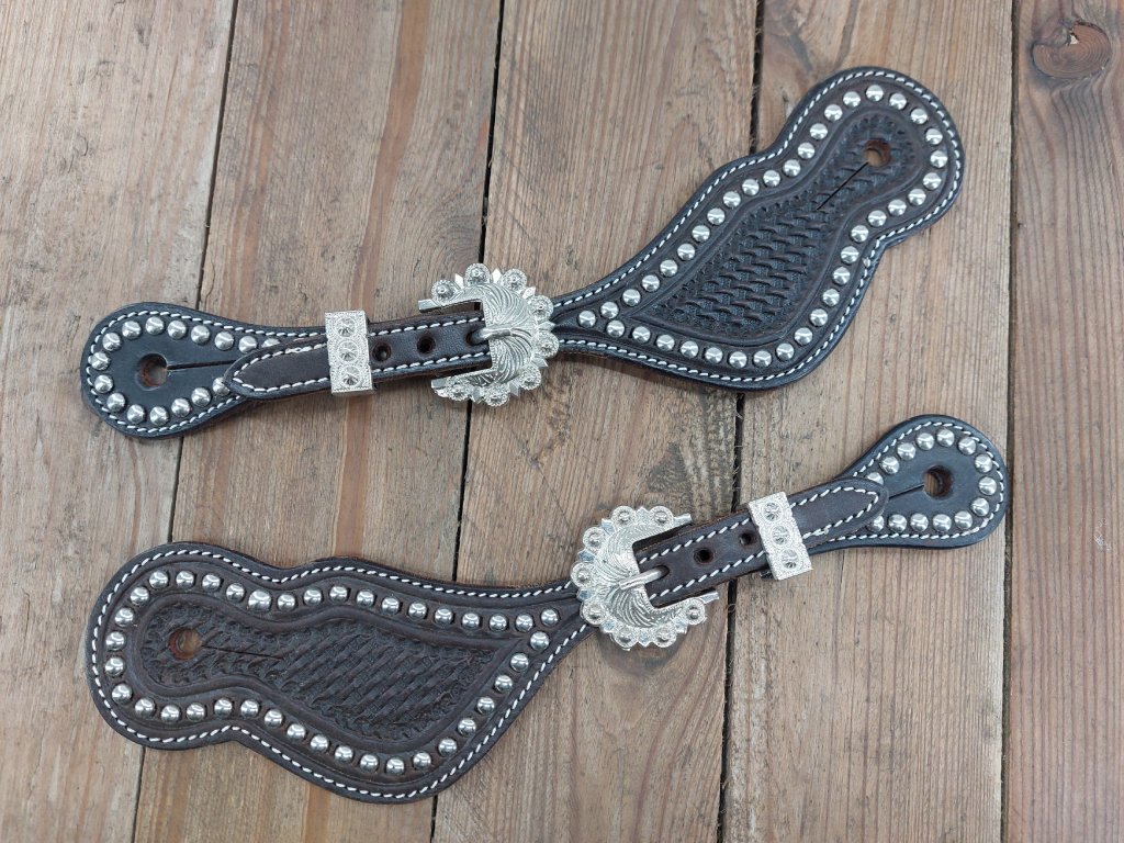 Show řemeny na ostruhy SN Tack s bohatým zdobením, stříbrnými nýty a dekorativní přezkou. Elegantní westernový doplněk vhodný pro závody i show.